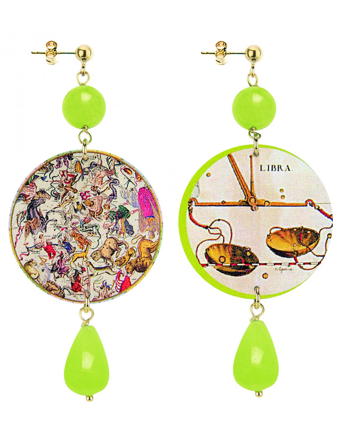 Orecchino bilancia, composto da una capsula piatta stampata. Elementi in ottone galvanizzato oro e pietre naturali. Lunghezza 8 cm.