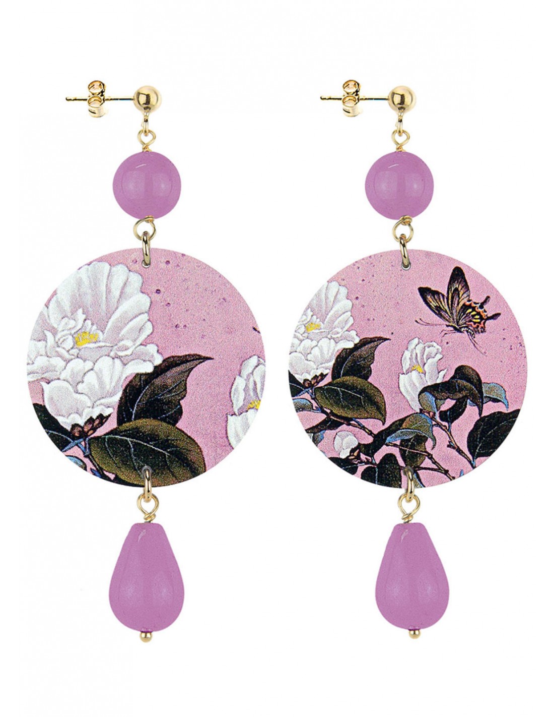 Orecchino viola, composto da una capsula piatta stampata. Elementi in ottone galvanizzato oro e pietre naturali. Lunghezza 8 cm.