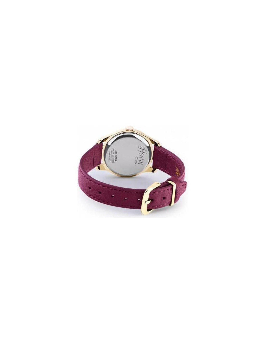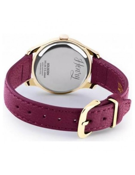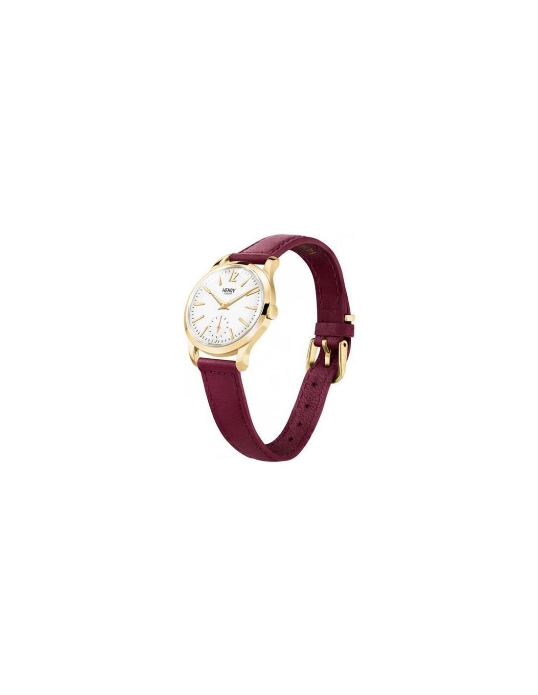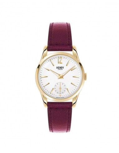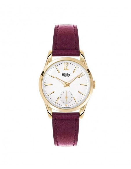 Orologio Henry London Holborn donna alimentazione al quarzo (batteria). Display analogico. Funzioni solo tempo. Impermeabilità 3 atm water resistant. Materiale cassa acciaio placcato oro giallo. Colore cassa oro giallo. Colore quadrante Bianco. Materiale cinturino pelle. Colore cinturino Amaranto.