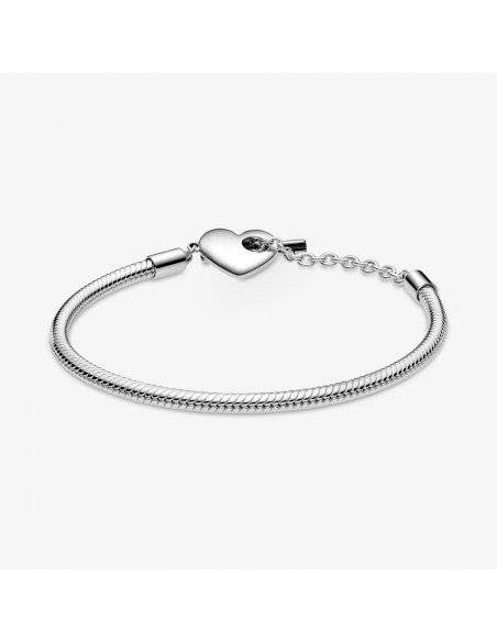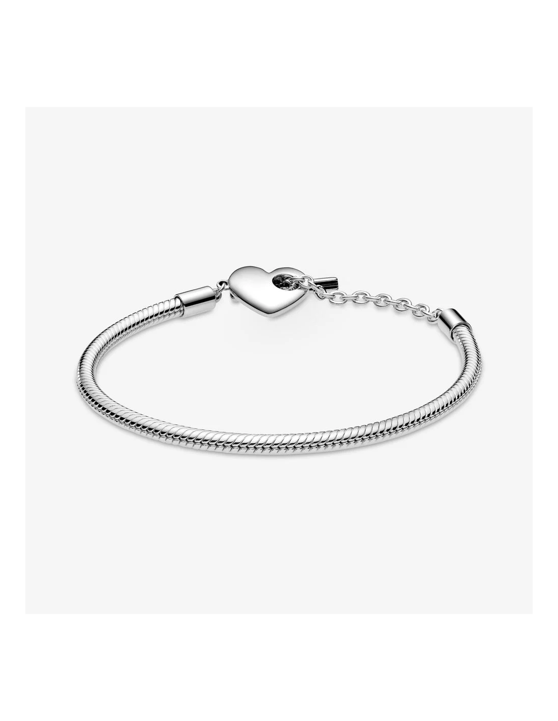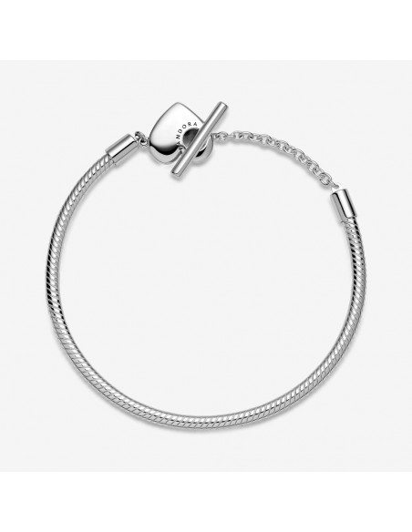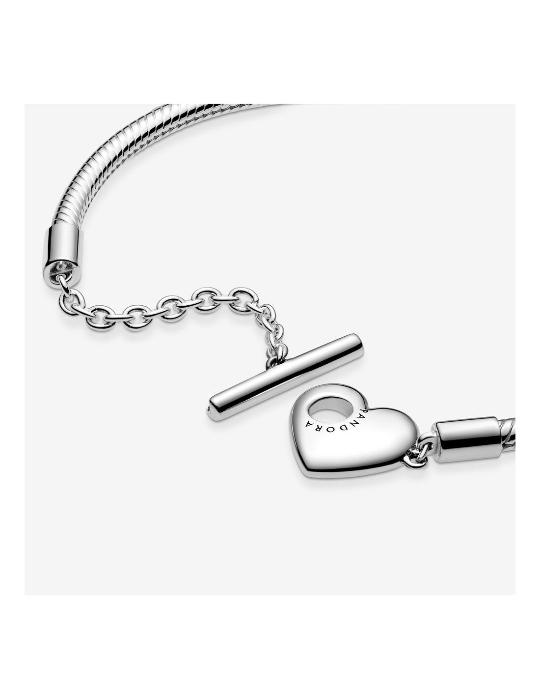 Aggiungi un tocco personalizzato alla tua collezione con questo bracciale Pandora Moments con maglia snake, cuore e barretta a T. Rifinito a mano e realizzato in Argento Sterling 925, il gioiello si ispira ai nostri classici bracciali con maglia snake e barretta a T della collezione Pandora Moments. Il bracciale presenta un disco a forma di cuore con un cerchio aperto su un lato in cui inserire la barretta a T per aprire e chiudere, mentre il retro è lucido e può essere inciso. Creato per poter contenere 10-13 charm, il gioiello può esprimere un messaggio d’amore unico.