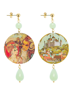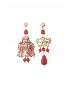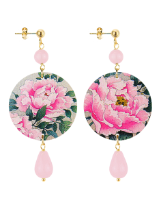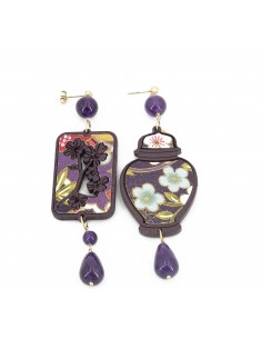 La collezione Potiche è realizzata con sete di antichi kimono giapponesi, stese su una base di legno laccata con antichi metodi orientali e montata in argento 925.  L’asimmetrica coppia è composta dalla sagoma di una Potiche, antico vaso giapponese in porcellana da un lobo e da un tralcio di fiori dall’altro. Dimensione piccolo 9 cm