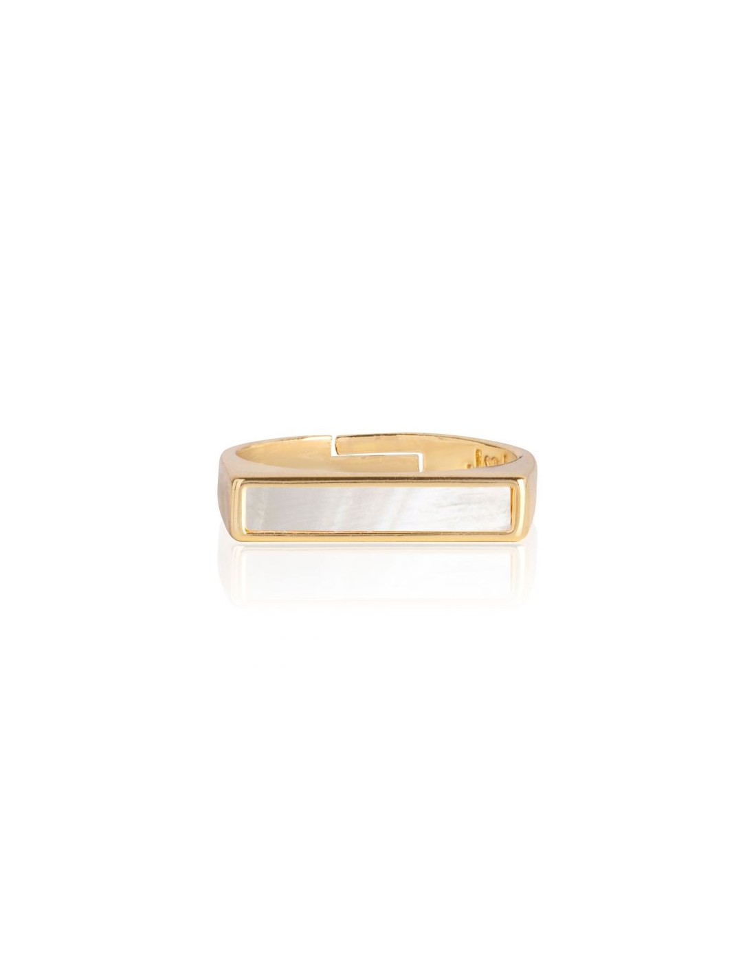 Un bellissimo design organico. Questo anello presenta un pezzo unico di conchiglia, incastonata in una barra liscia oro giallo con una fascia regolabile. L'aggiunta perfetta per lo stile quotidiano.