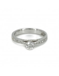 Anello Solitario in oro bianco (750) con Diamante centrale e piccoli diamanti incastonati sul gambo.