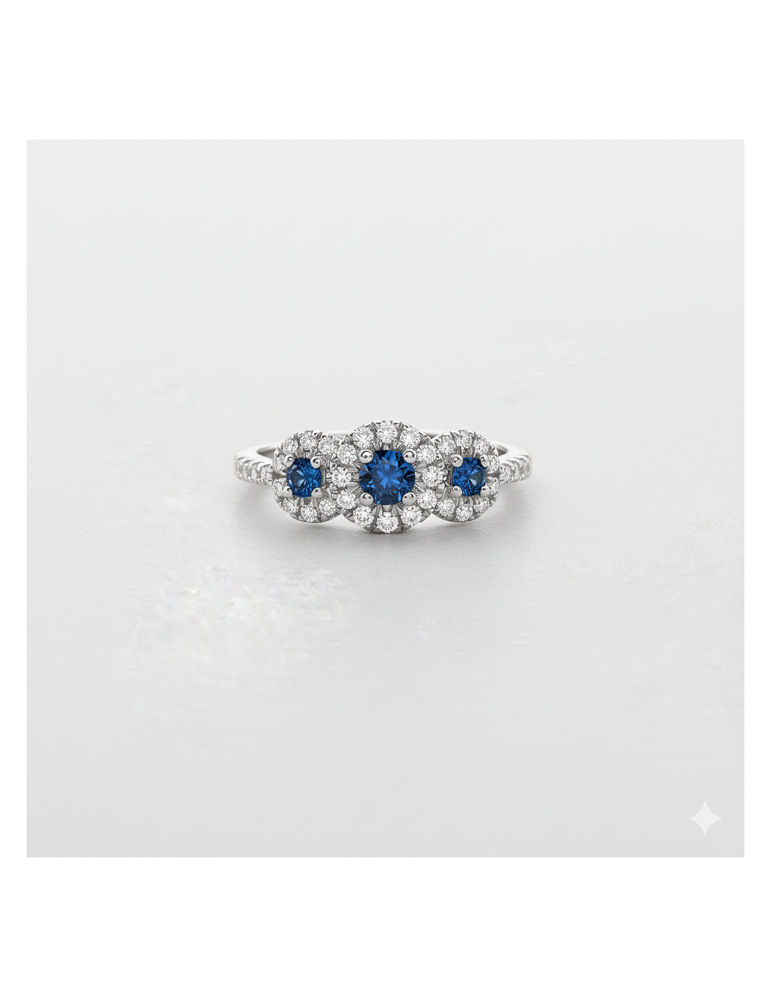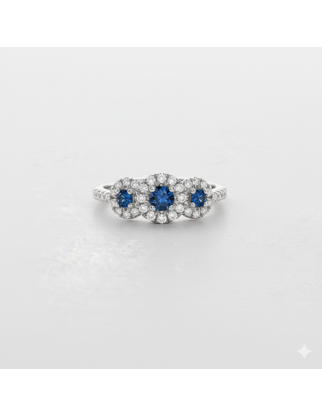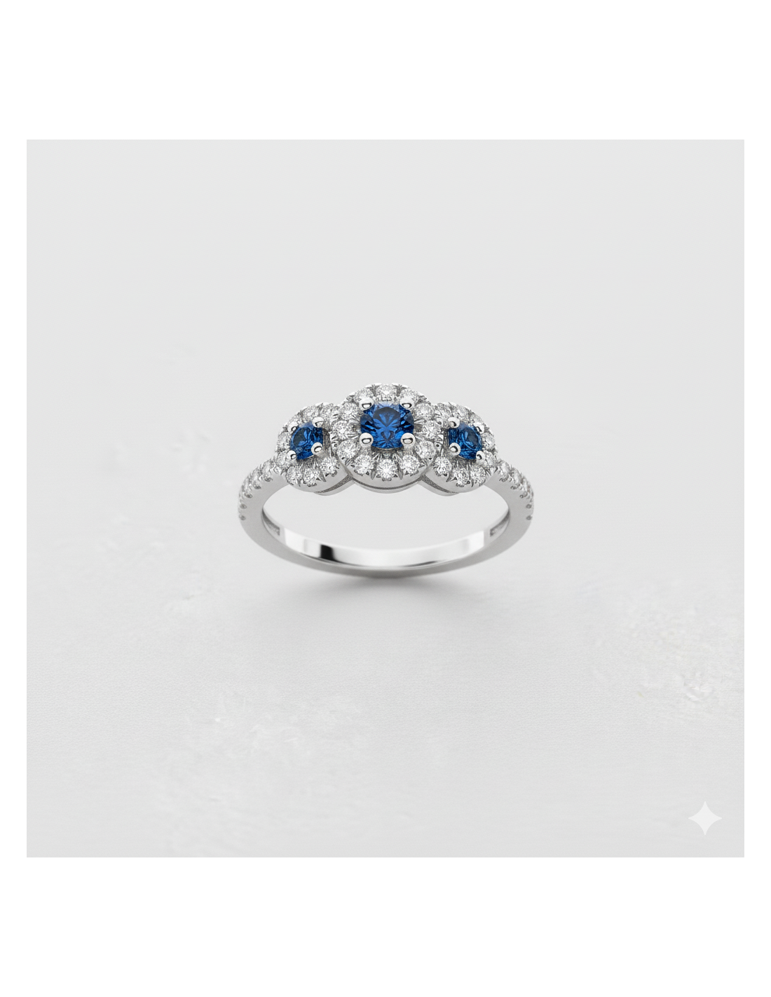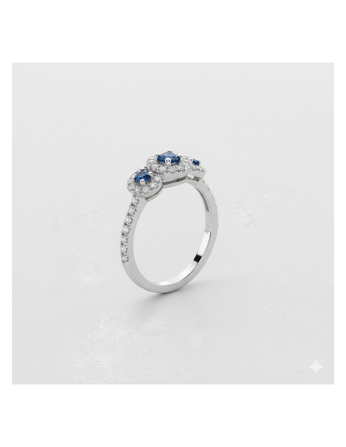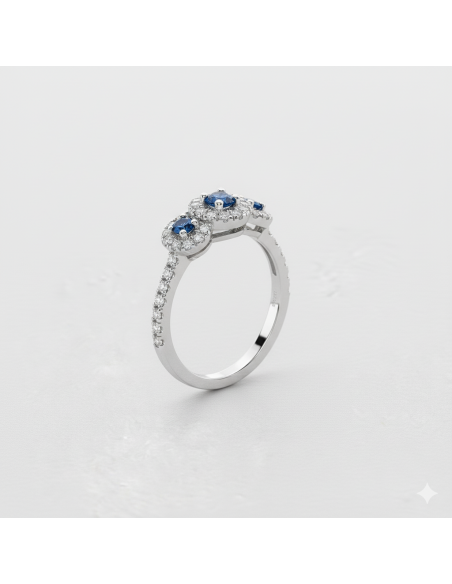 anello trilogy in oro bianco con zaffiri centrali e contorno di diamanti taglio brillante con gambo incassato di diamanti