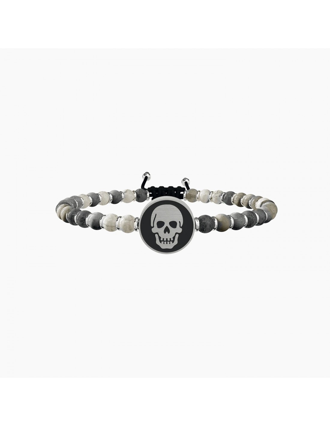 Una vita sul Þlo del rasoio, senza avere paura di nulla, nemmeno della morte. Libero e forte, segui il tuo istinto e vivi ogni attimo come se fosse l'ultimo. Bracciale con sfere in agata grigia e piastra tonda Teschio in acciaio di colore nero.