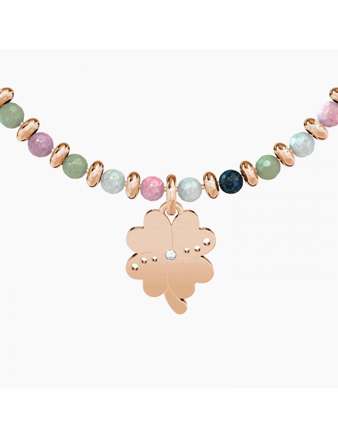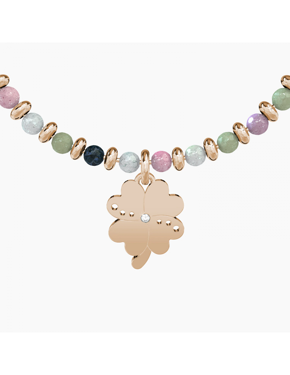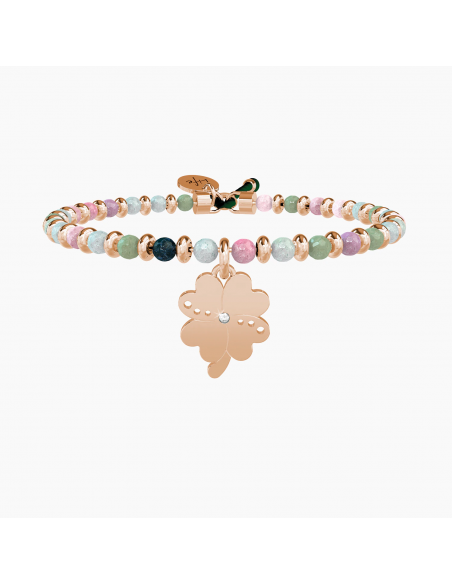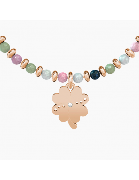 Bangle con filo armonico in acciaio color oro rosa, sfere in agata multicolor e ciondolo Quadrifoglio.