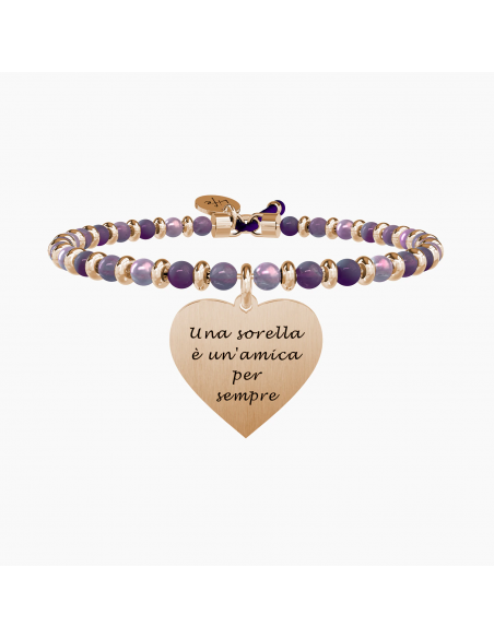 Bangle con filo armonico in acciaio color oro rosa, sfere in ametista e ciondolo satinato a cuore.