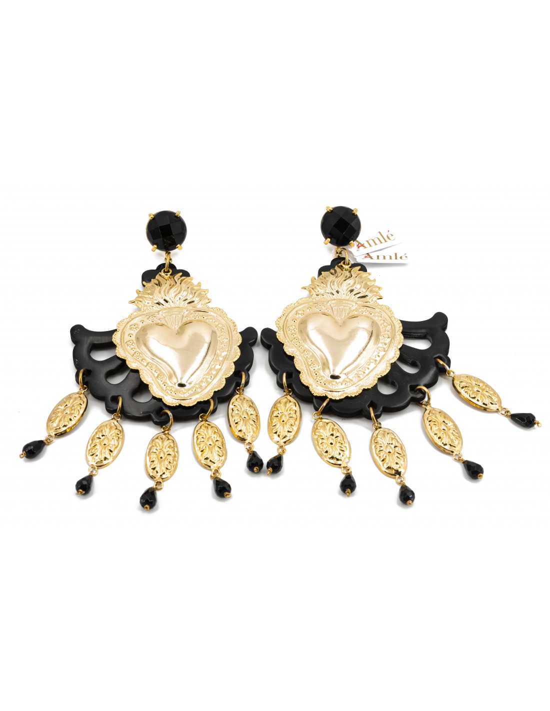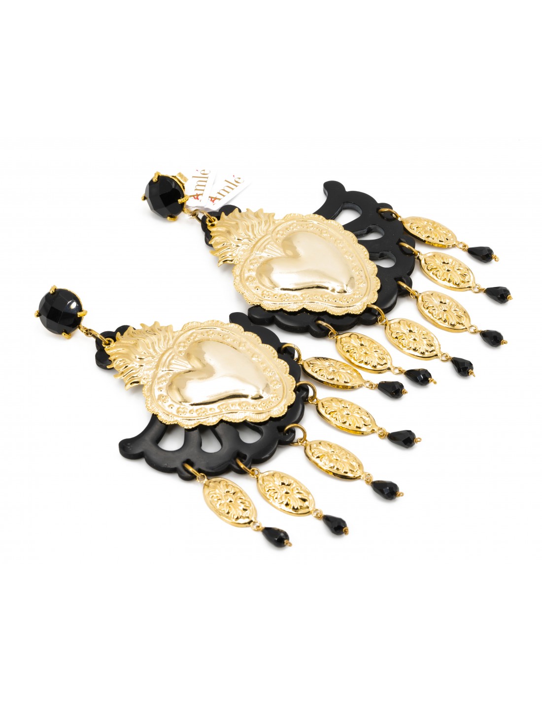 Orecchini Amlè in Corno Nero, Onice Nera, Cuore Sacro Pendente in Argento Dorato (925). Chiusura a Perno con Farfallina. Lunghezza Orecchino: 14cm.