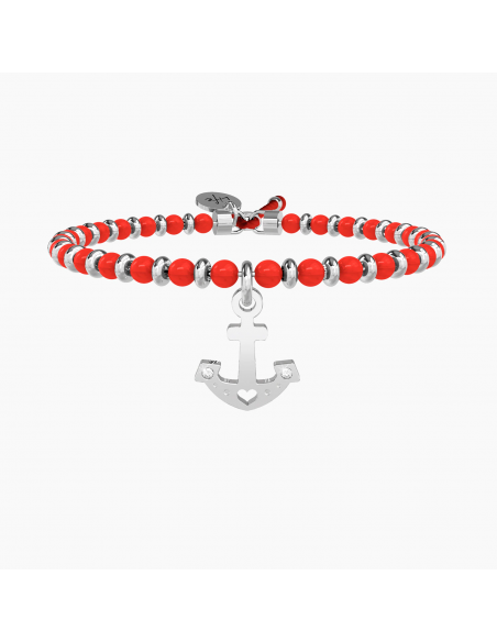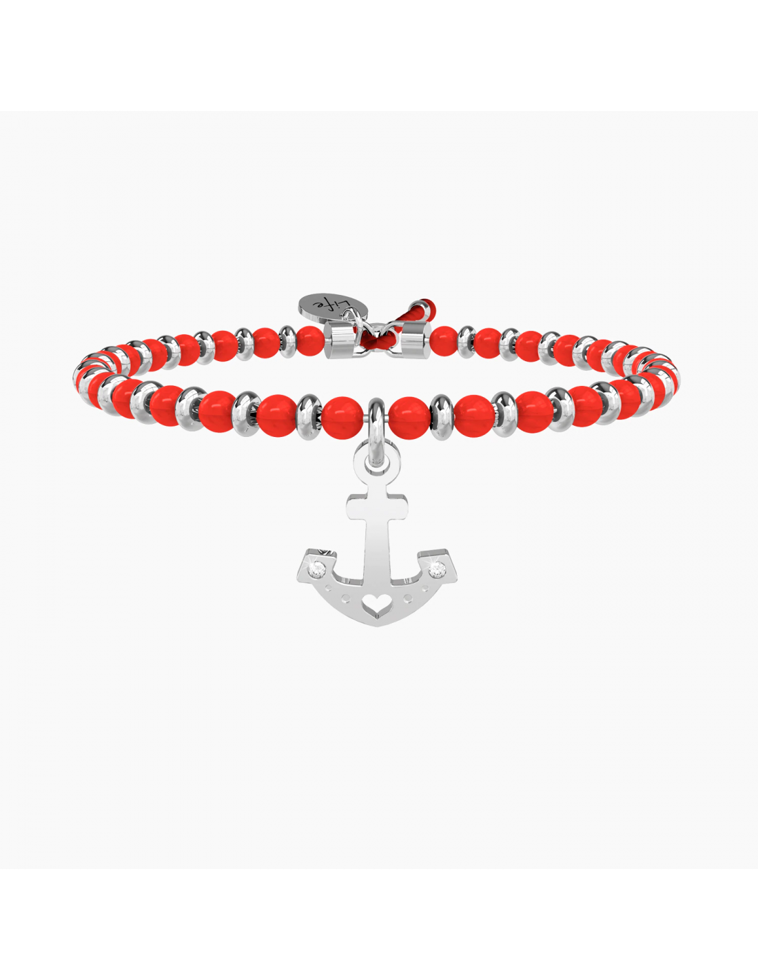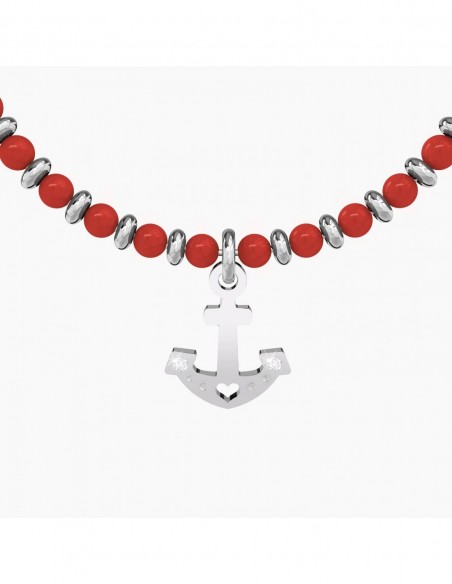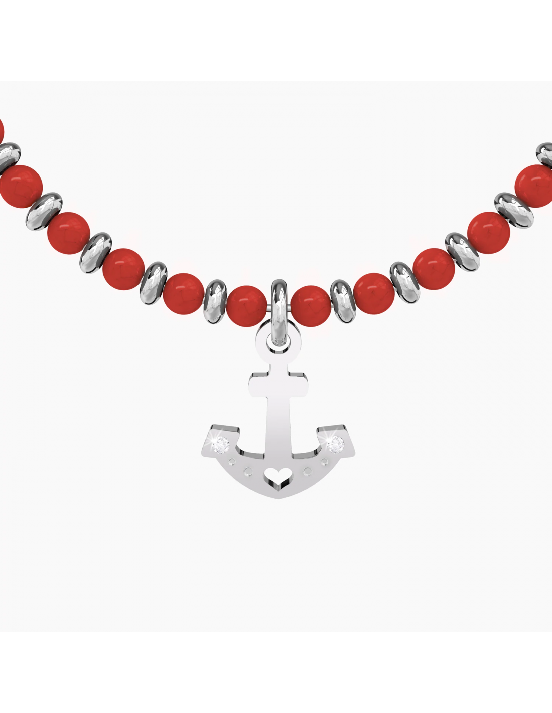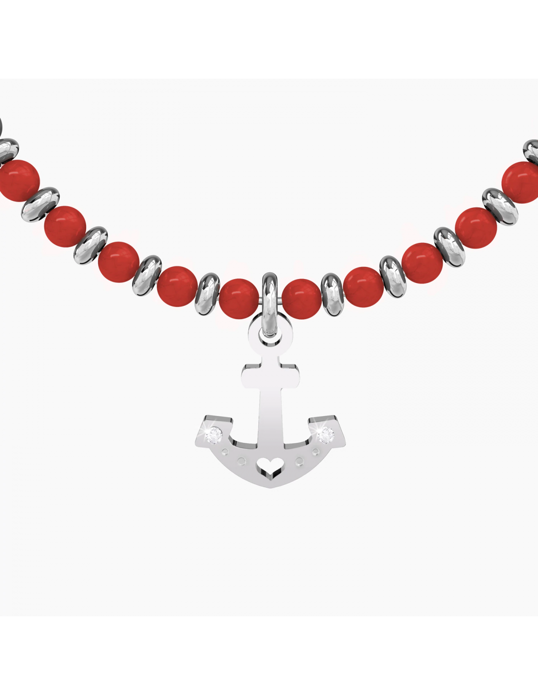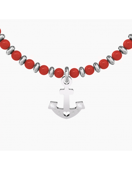 Bangle con filo armonico in acciaio, sfere in corallo rosso e ciondolo ad ancora.
