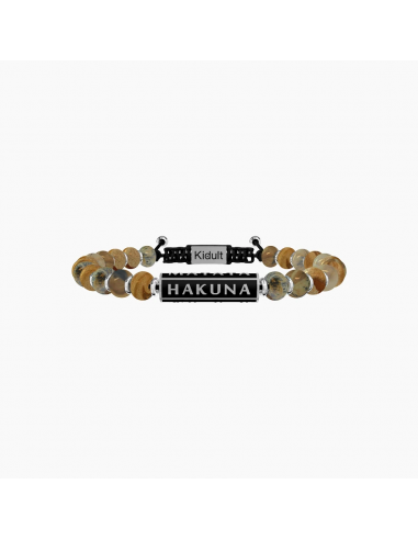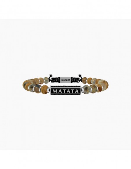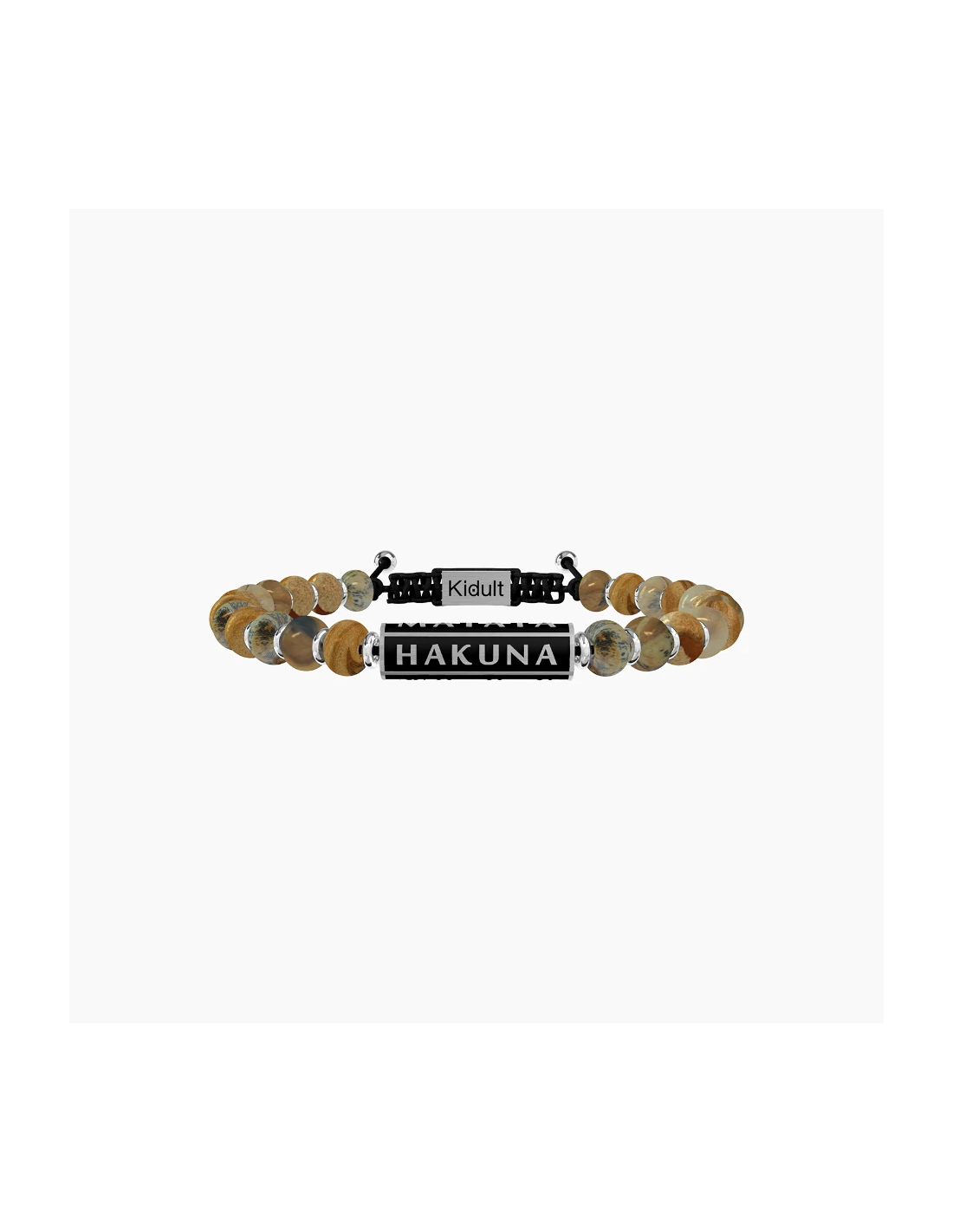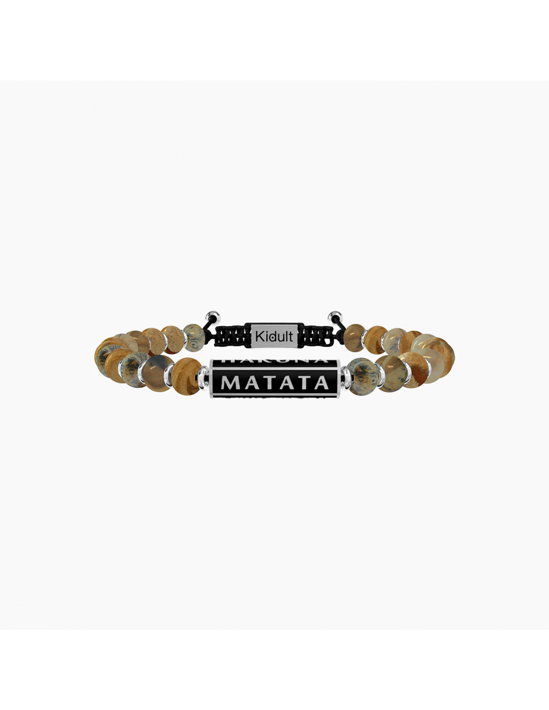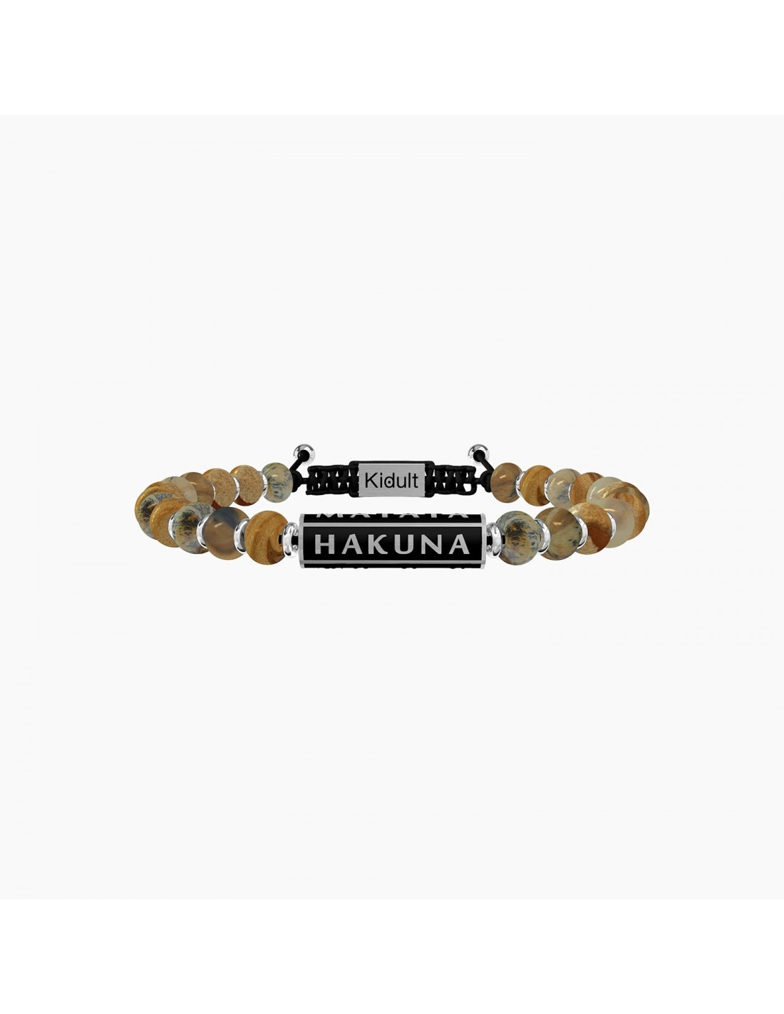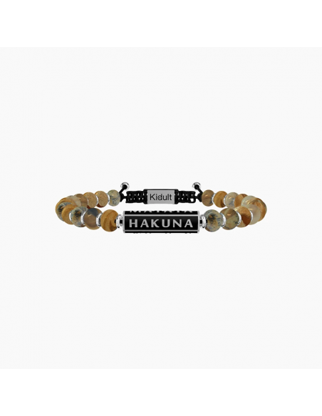 Bracciale con sfere in diaspro e elemento cilindrico in acciaio di colore nero.