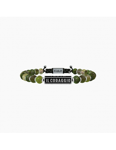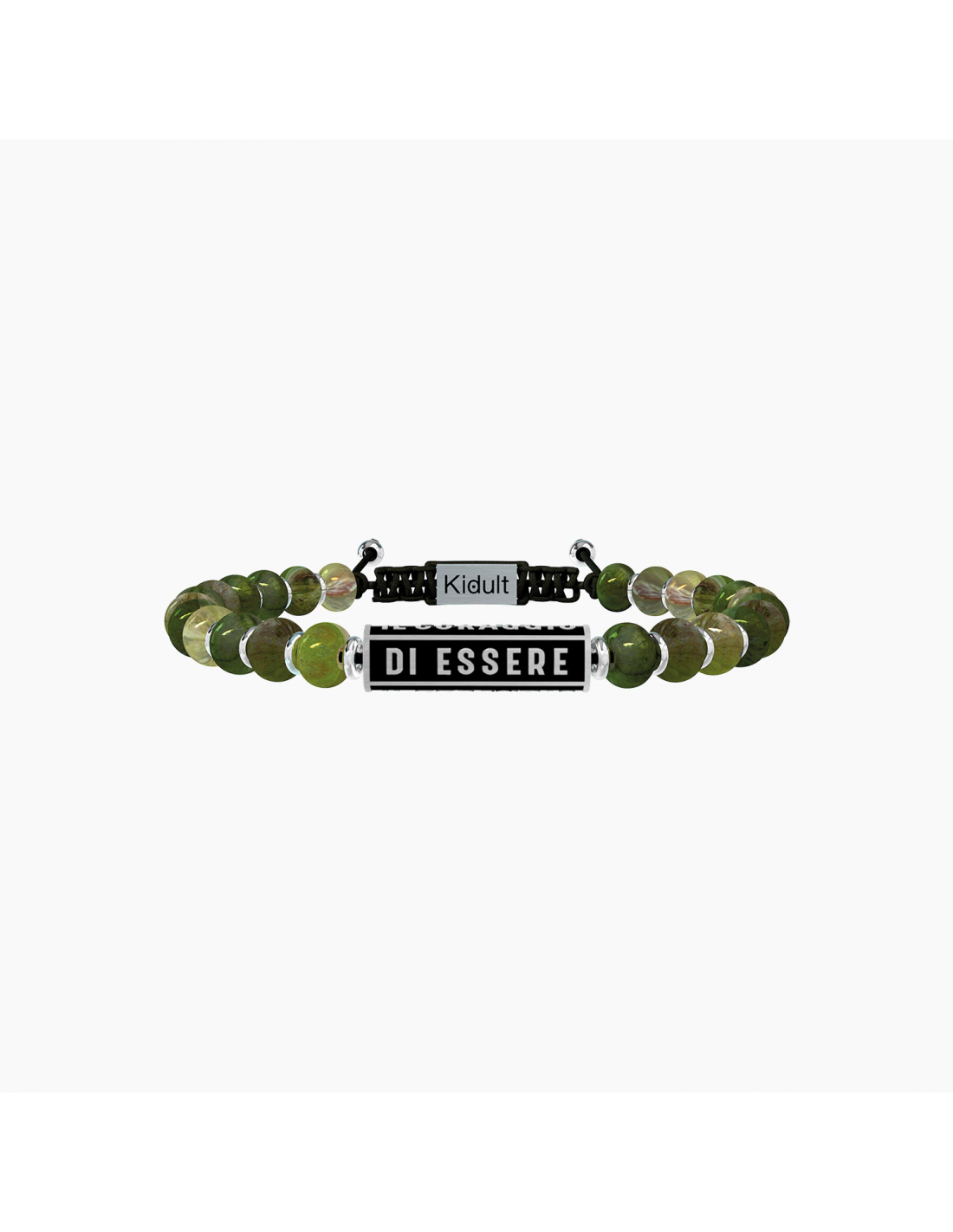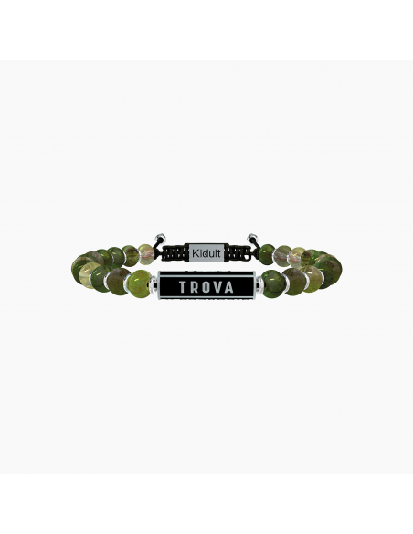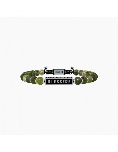 Bracciale con sfere in diaspro verde e elemento cilindrico in acciaio di colore nero.