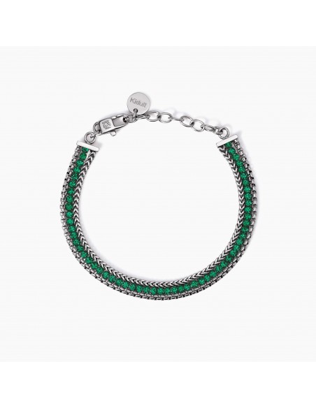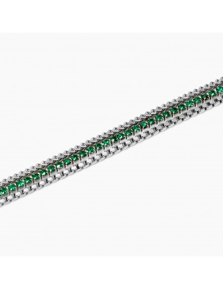 Bracciale regolabile in acciaio con due catene e tennis di cristalli verdi.