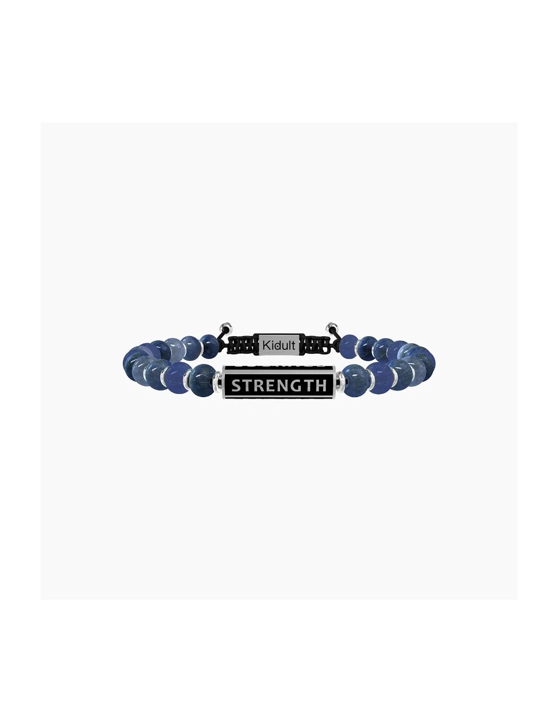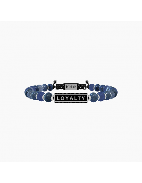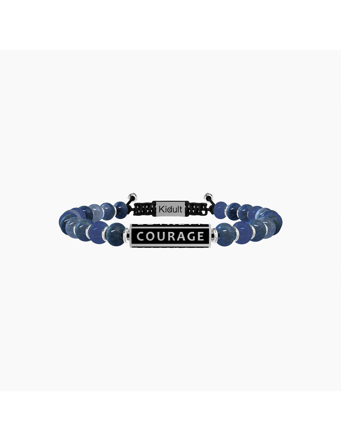 Sii forte come un leone, rispetta il prossimo, rimani fedele ai tuoi valori, osa sempre con coraggio. Bracciale con sfere in dumortierite blu e elemento cilindrico in acciaio di colore nero.