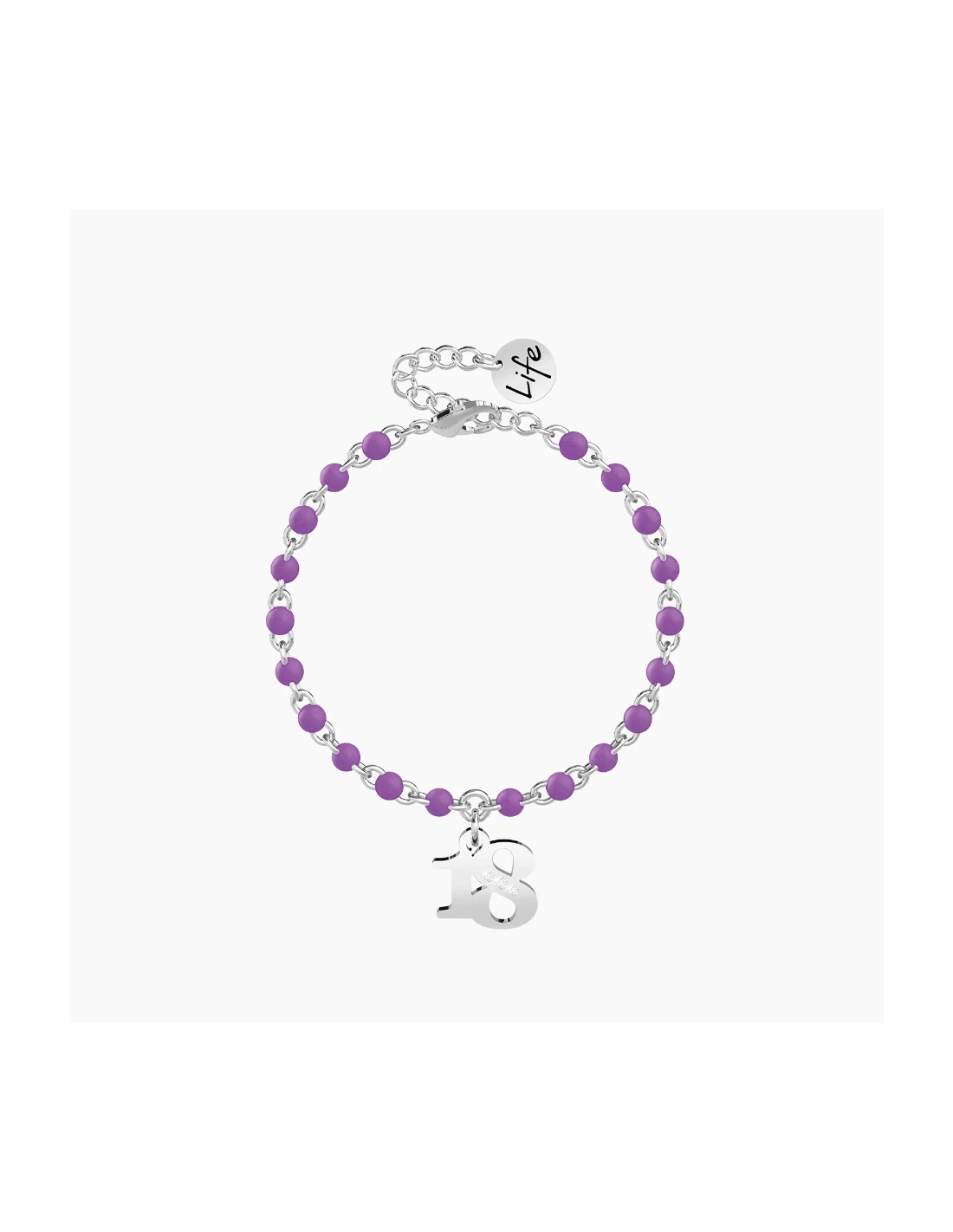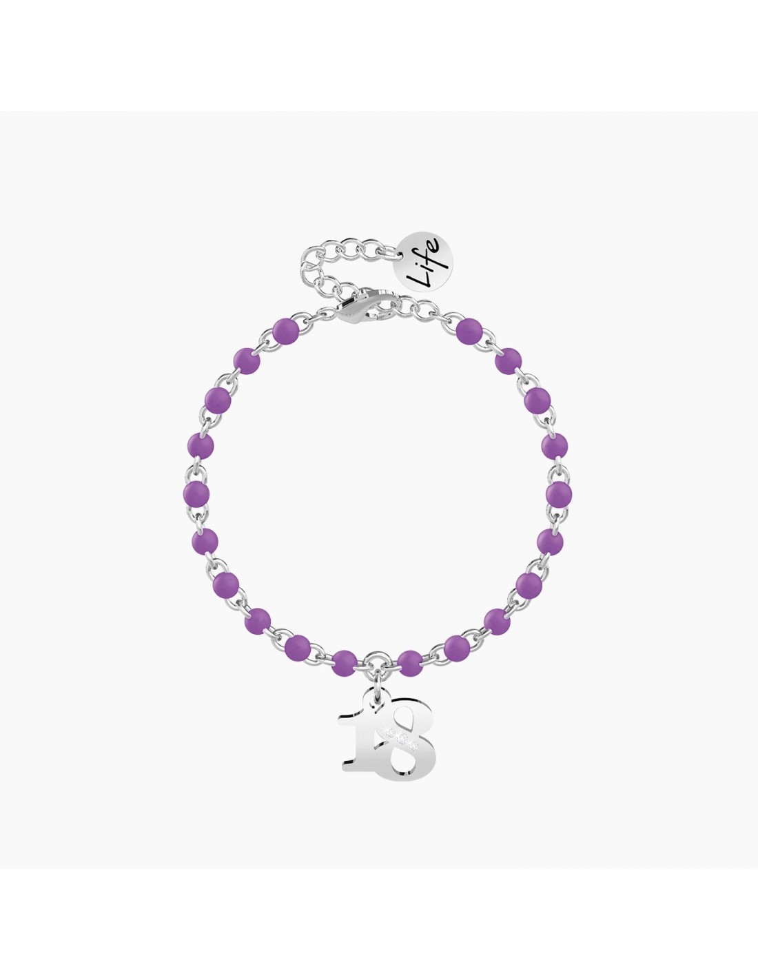 Cogli l'attimo, vivi il presente. Bellezza e spensieratezza, amore e passione, sono questi gli anni pi belli della vita e sono qui, davanti a te. Buon diciottesimo! Bracciale in acciaio con ciondolo a 18 e catena rol˜ con inserimenti in smalto viola.