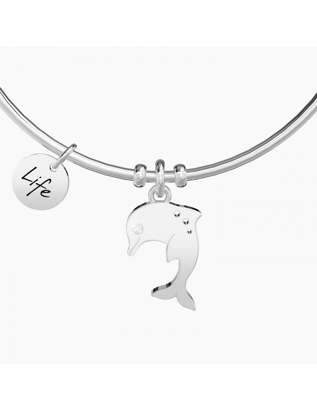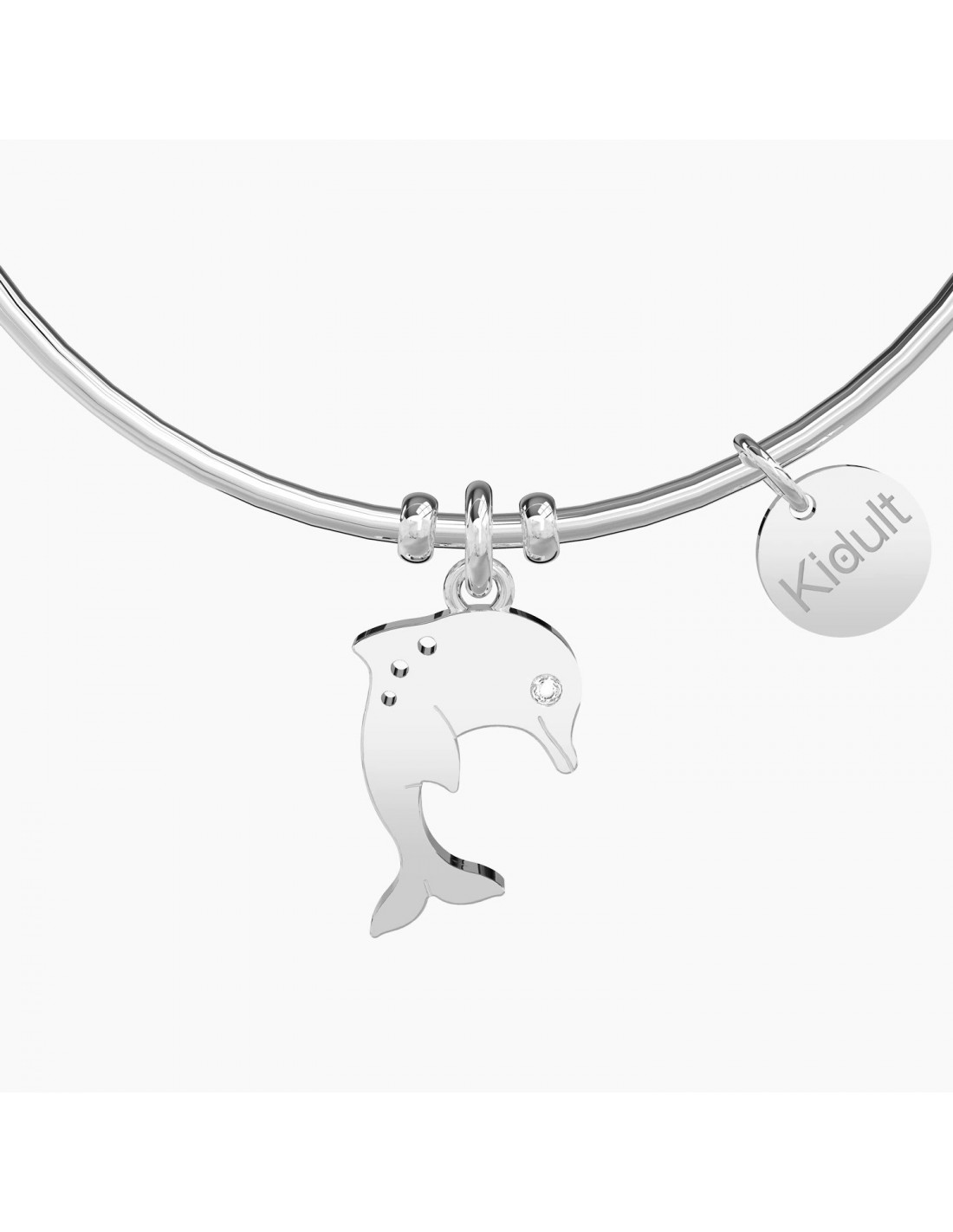 Ti piace ridere e giocare tra le onde, fare capriole e salti nel blu. Con il tuo buonumore regali al mondo ogni giorno un sorriso. La tua anima  cristallina come il mare, i tuoi sorrisi riscaldano pi del sole. Bangle in acciaio con ciondolo Delfino.