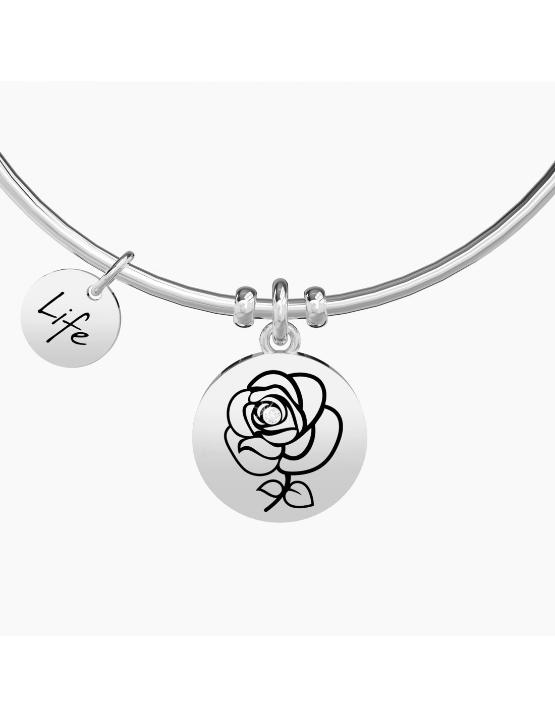 Un fiore per te che vivi di passione e amore ogni giorno. Rosa preziosa ed eterna che tra le tue mani non appassirˆ mai. Bangle in acciaio con ciondolo Rosa.