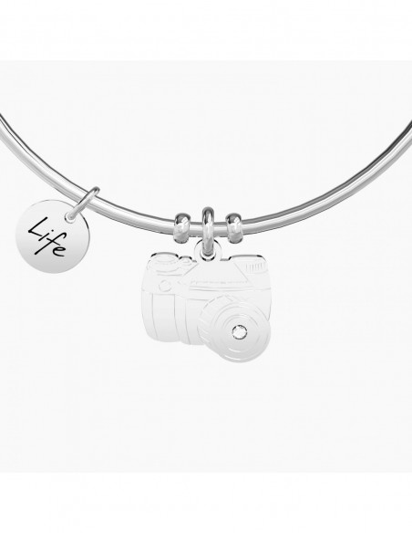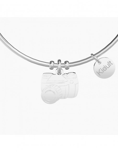 Bangle in acciaio con ciondolo a forma di macchina fotografica.
