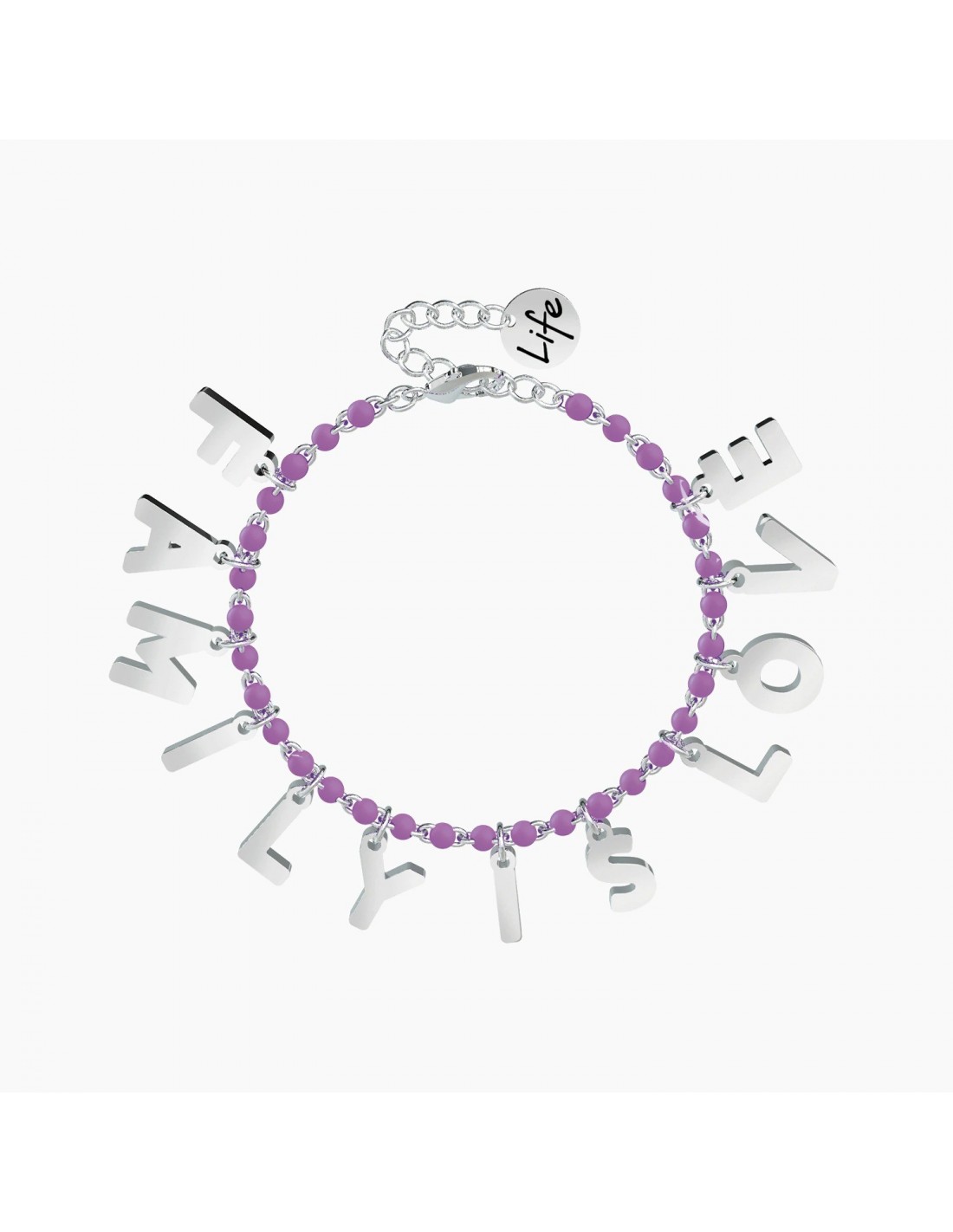 Bracciale in acciaio con ciondoli Family is Love e catena rol con inserimenti in smalto viola.