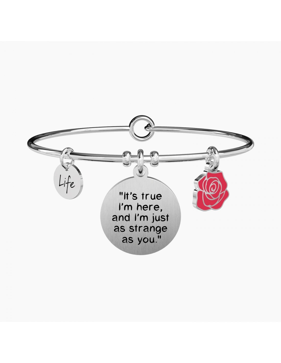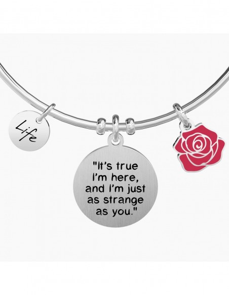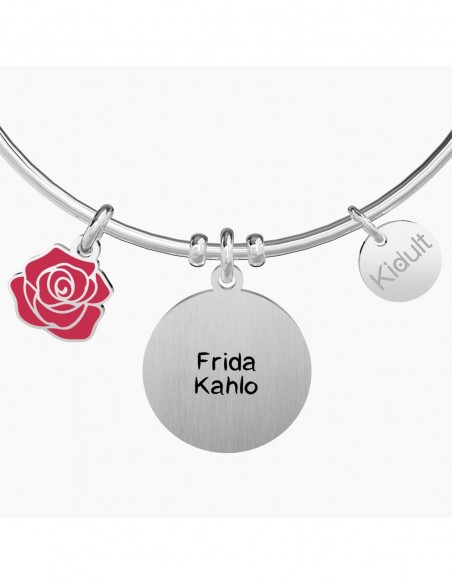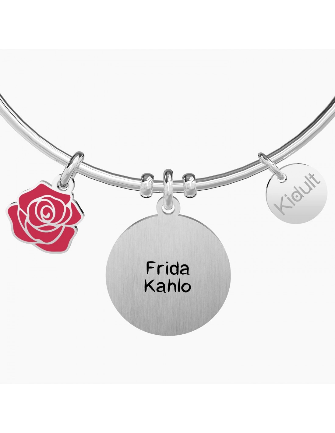 Bangle in acciaio con ciondoli satinato tondo e a rosa smaltata rossa.