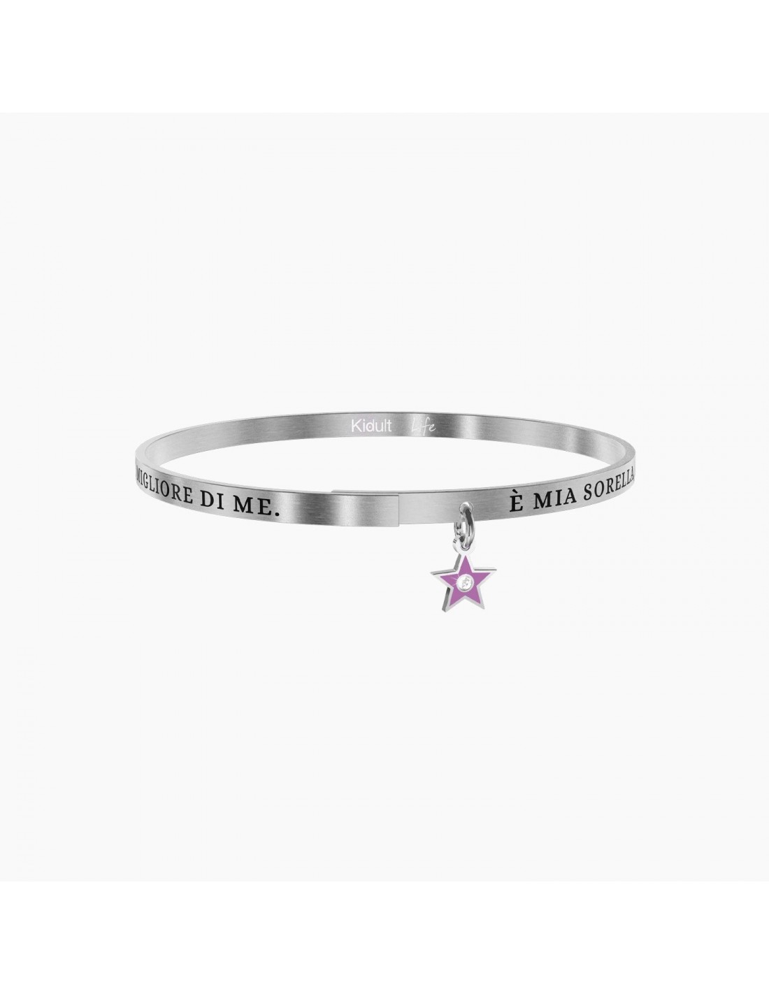 é mia sorella, la mia migliore amica, la mia anima gemella e la parte migliore di me. Bangle sottile in acciaio satinato con scritta e piccolo ciondolo a stella smaltato lilla.