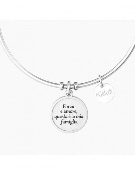 Forza e amore, questa la mia famiglia Bangle in acciaio con ciondolo satinato tondo con rifinitura borchiata e cristallo.