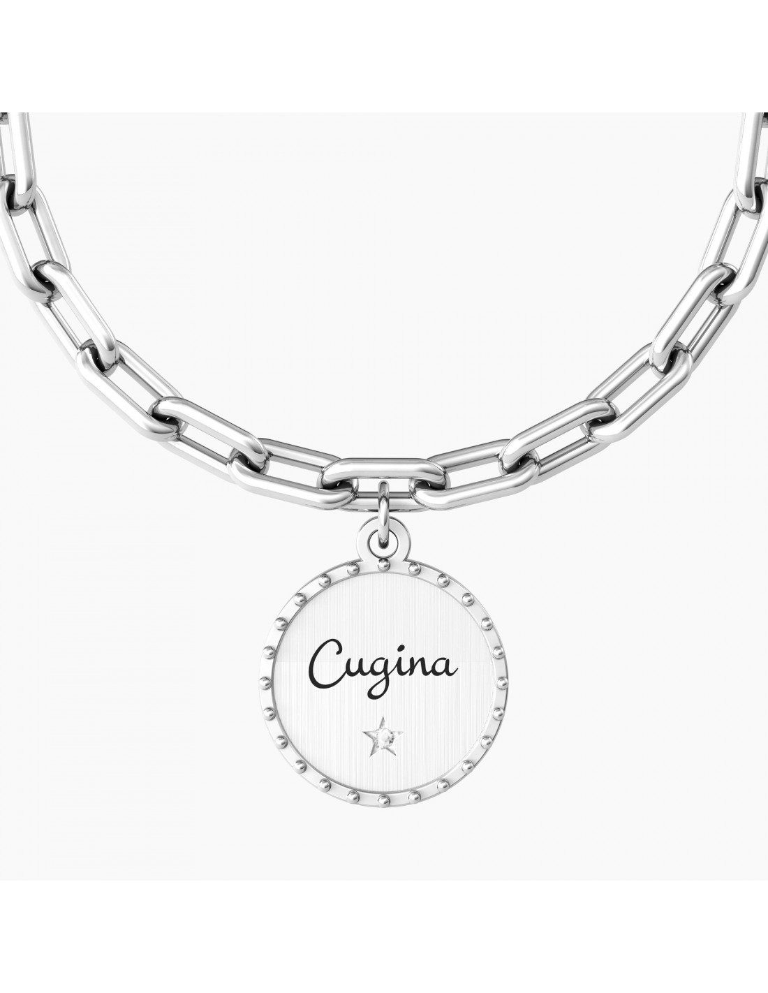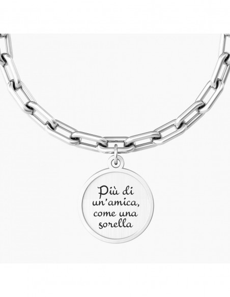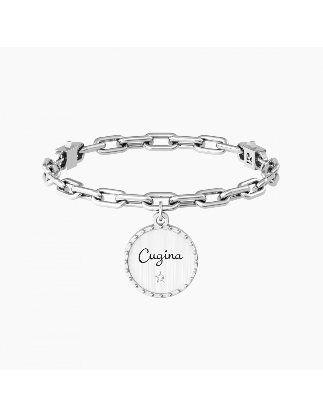 Bracciale in acciaio con catena a maglie ovali "comfort fit" e ciondolo satinato tondo con rifinitura borchiata e cristallo.