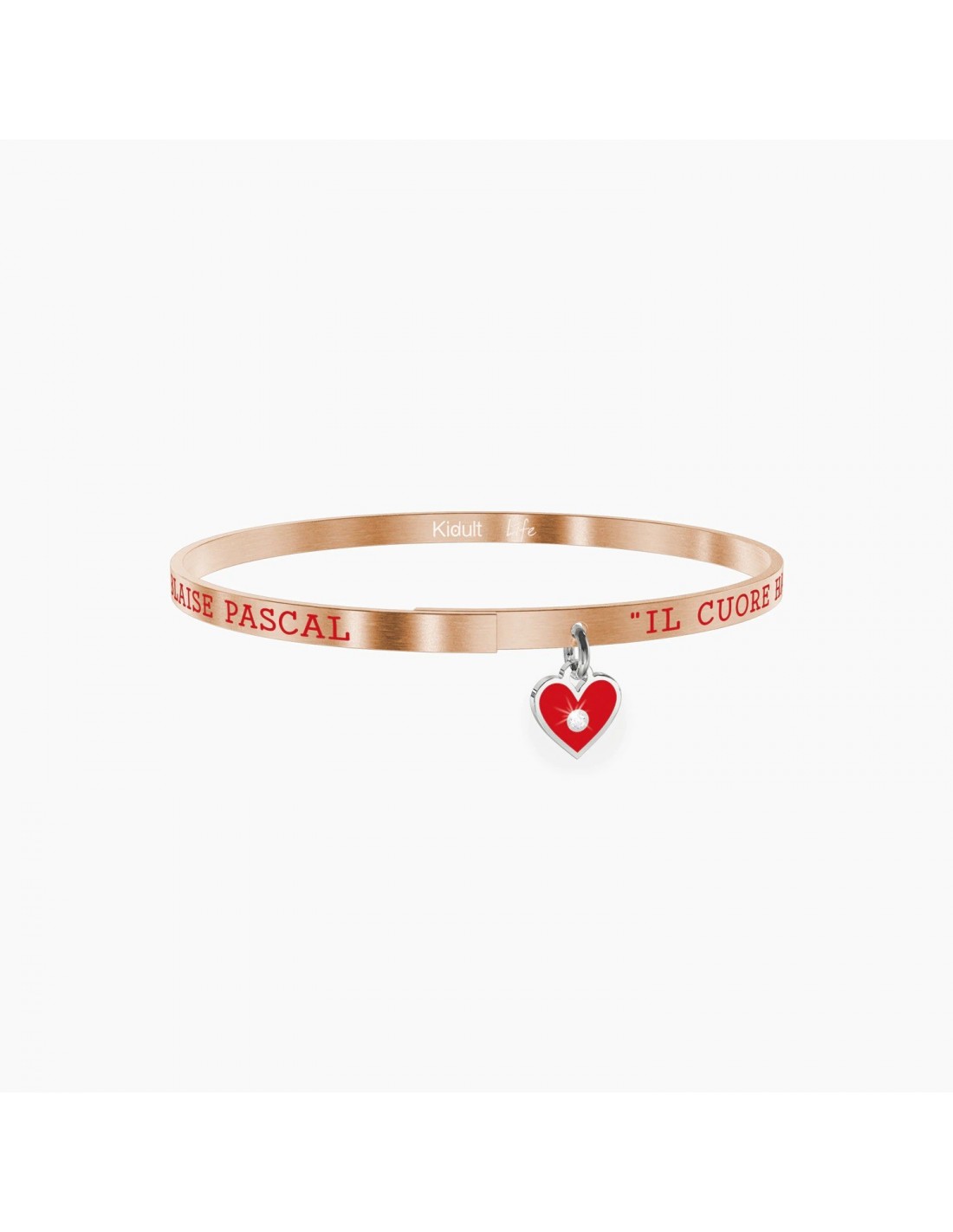 "Il cuore ha le sue ragioni, che la ragione non conosce." - Blaise Pascal - Bangle sottile in acciaio satinato color oro rosa con scritta e piccolo ciondolo a cuore smaltato rosso.