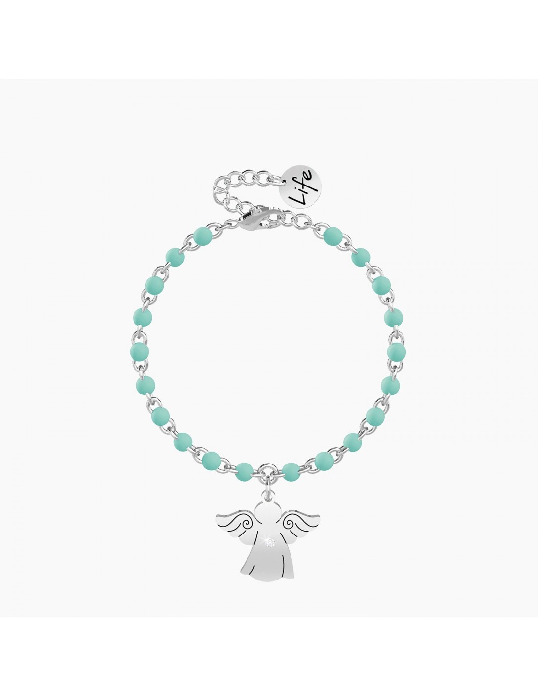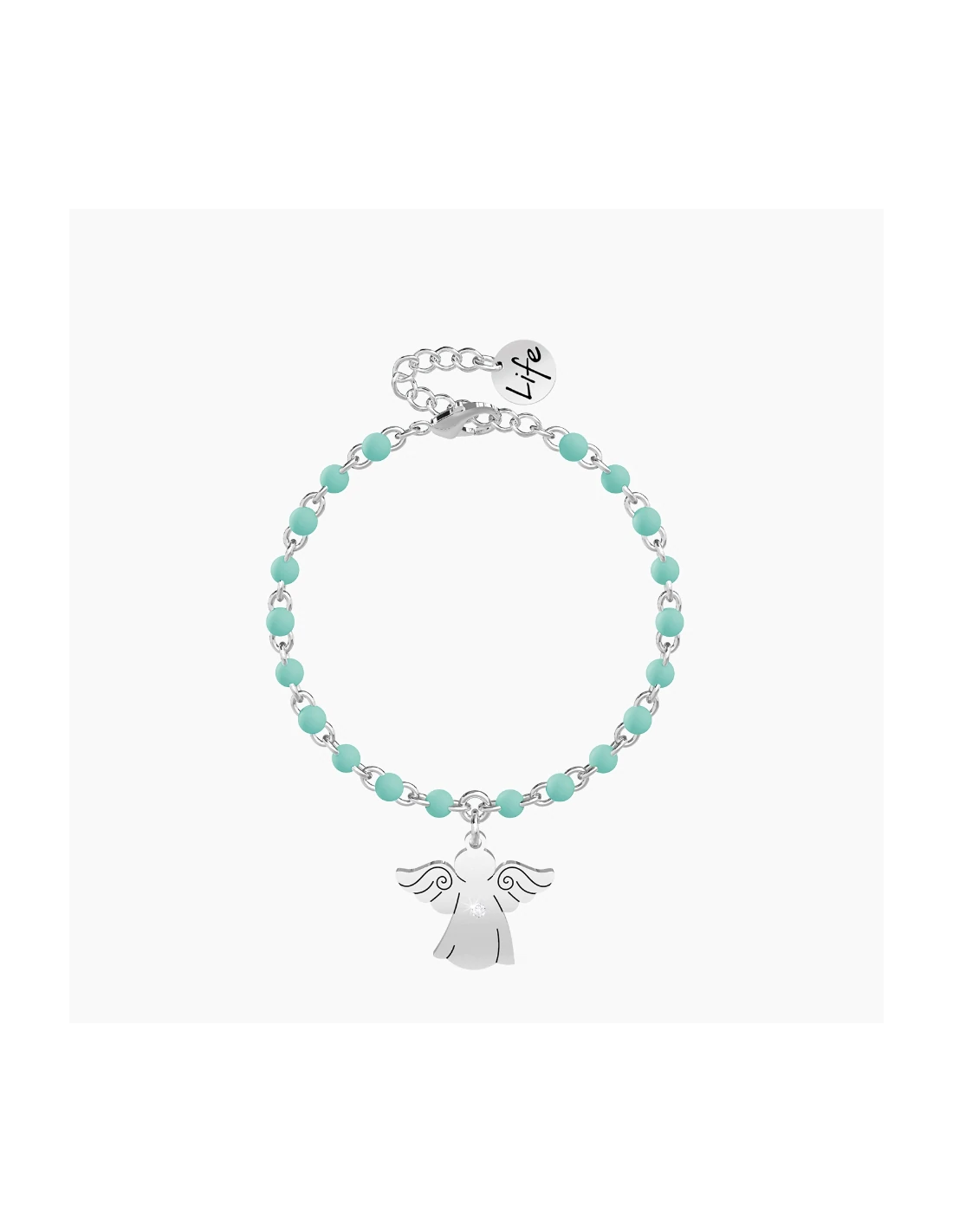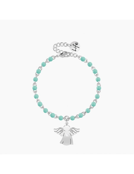 Con Lui al tuo fianco pi sicuro  il sentiero del tuo cammino. Affronta la vita libero di seguire il tuo istinto perchŽ avrai sempre accanto chi ti protegge. Bracciale in acciaio con ciondolo ad angelo e catena rol˜ con inserimenti in smalto verde acqua.