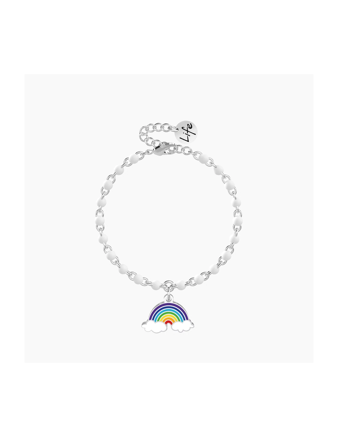 Bracciale in acciaio con ciondolo ad arcobaleno smaltato e catena rol con inserimenti in smalto bianco.