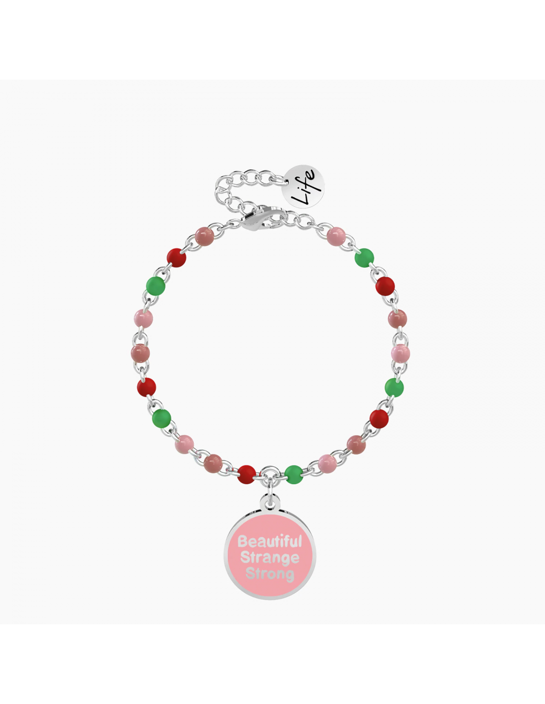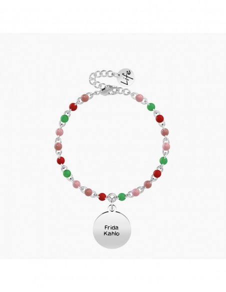 Bracciale in acciaio con ciondolo tondo smaltato rosa e catena rol con inserimenti in smalto multicolor.