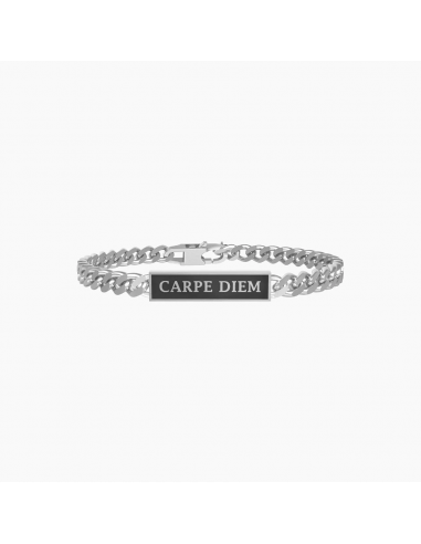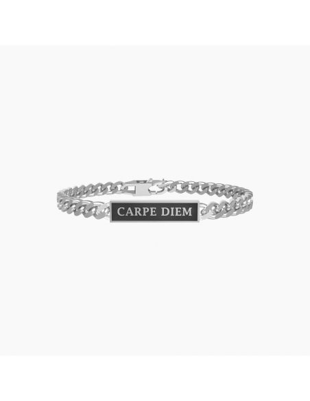 Bracciale in acciaio satinato con catena groumette e piastra rettangolare di colore nero.