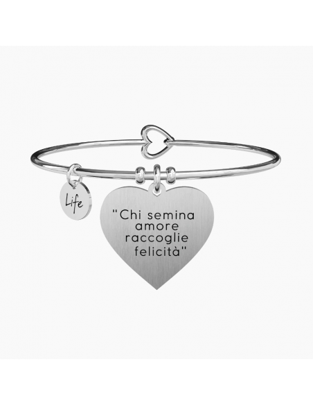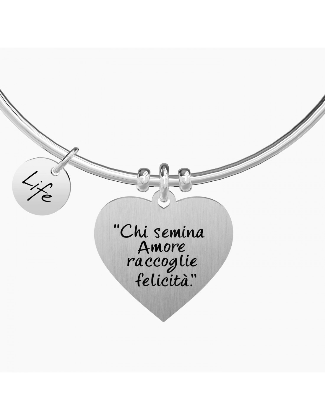 "Chi semina amore raccoglie felicitˆ". - Shakespeare - Bangle in acciaio con ciondolo satinato a cuore.
