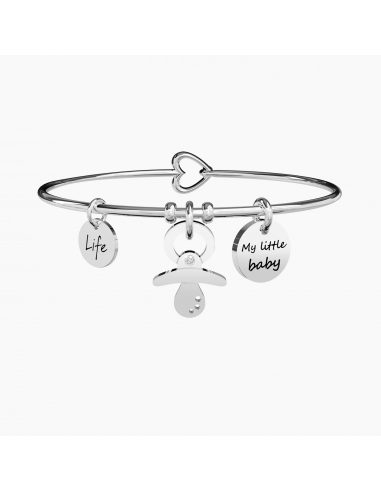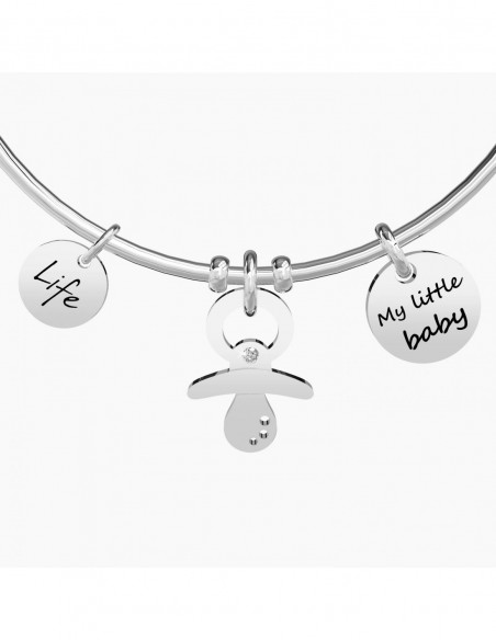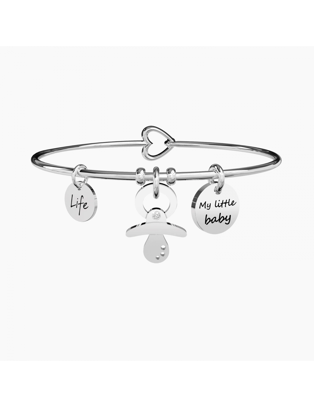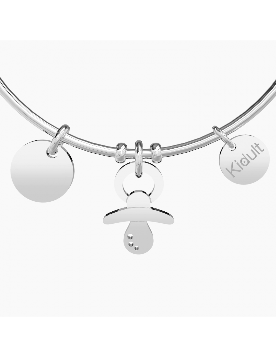 Nascere e crescere, il miracolo della vita che si compie. Un pensiero dedicato a te, per celebrare l'arrivo del tuo futuro. Congratulazioni! Bangle in acciaio con ciondoli Ciuccio e piastra tonda.