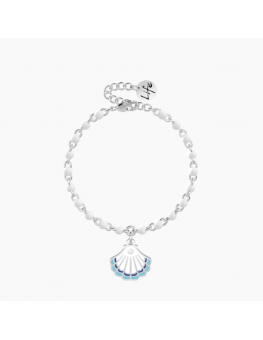 Custodisce ricchezza, racchiude saggezza, uno scrigno di gioia e fortuna che atterra sulla tua riva. Bracciale in acciaio con ciondolo a conchiglia smaltato e catena rol˜ con inserimenti in smalto bianco.