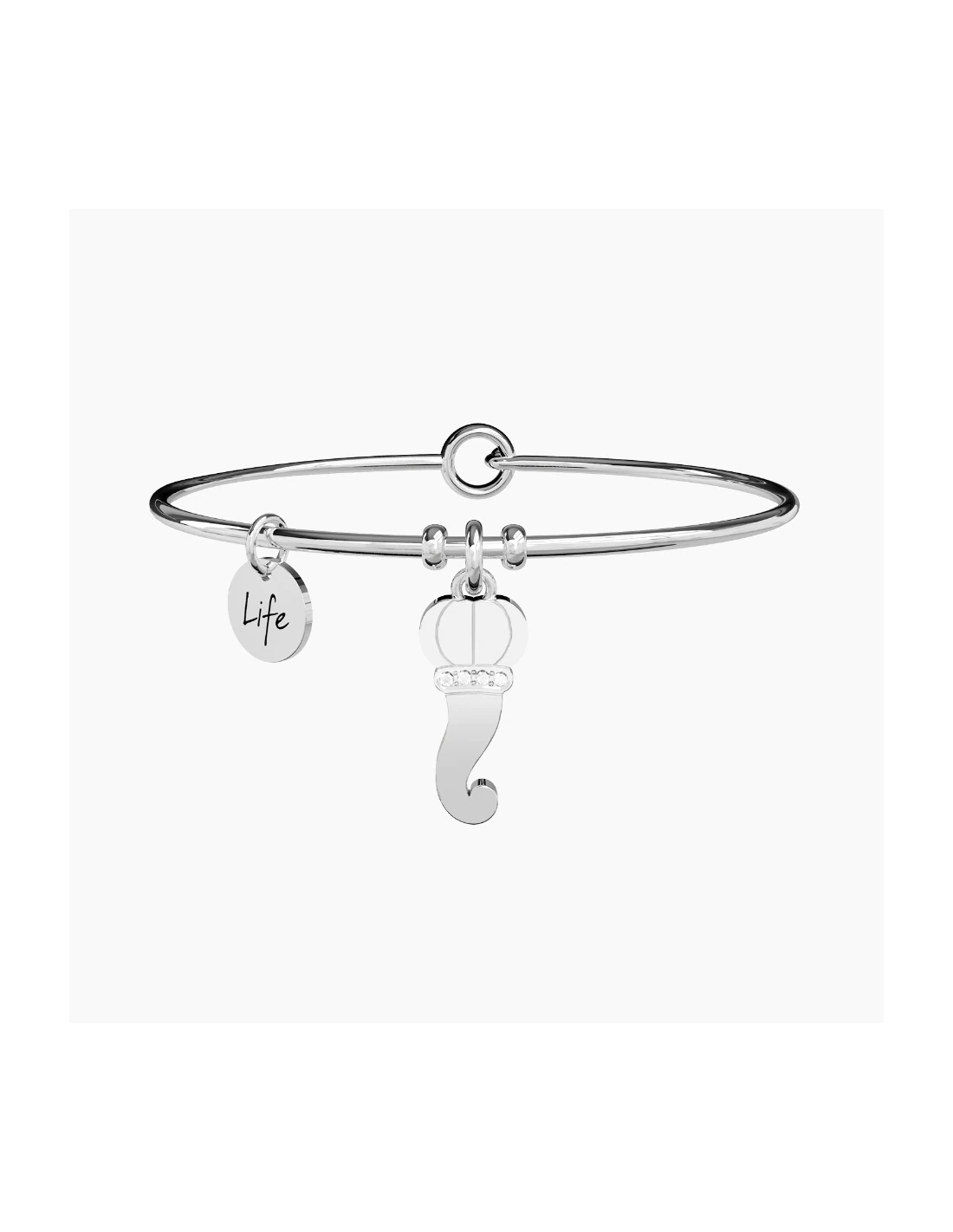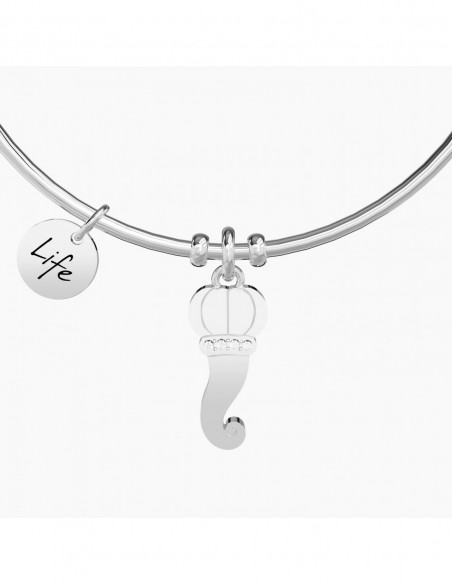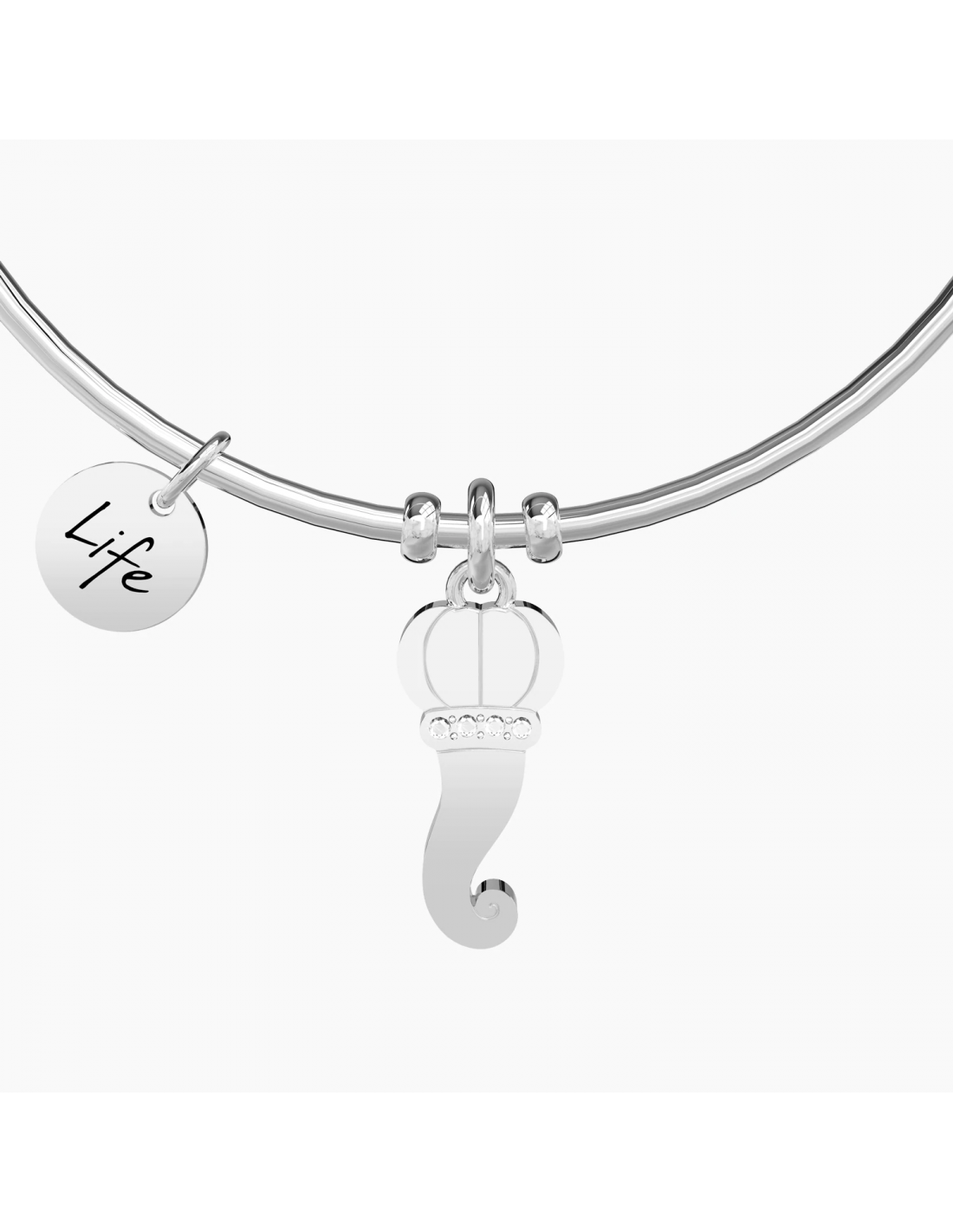 é l'arma per vincere ogni tua sfida, ti protegge dai guai che riserva la vita. Allontana l'invidia del male qui intorno, toccalo sempre, ogni mese, ogni giorno. Bangle in acciaio con ciondolo a forma di cornetto.