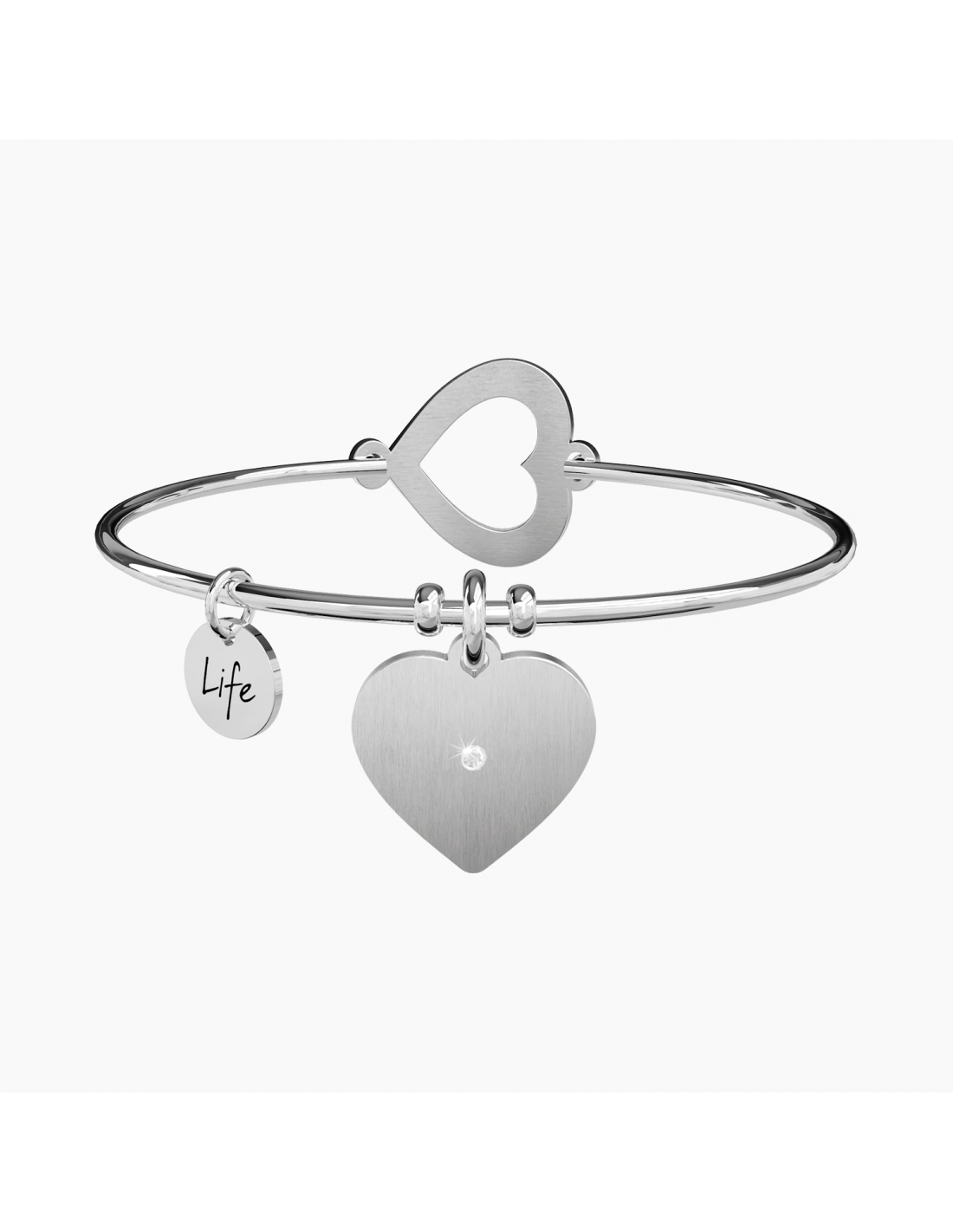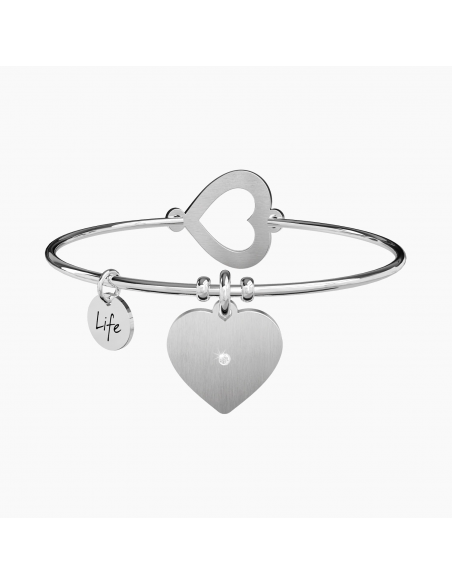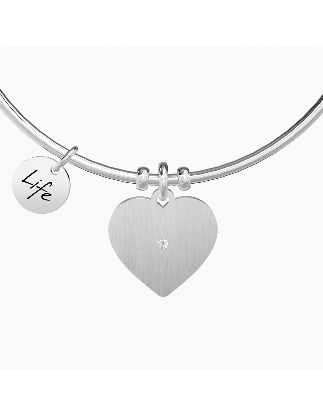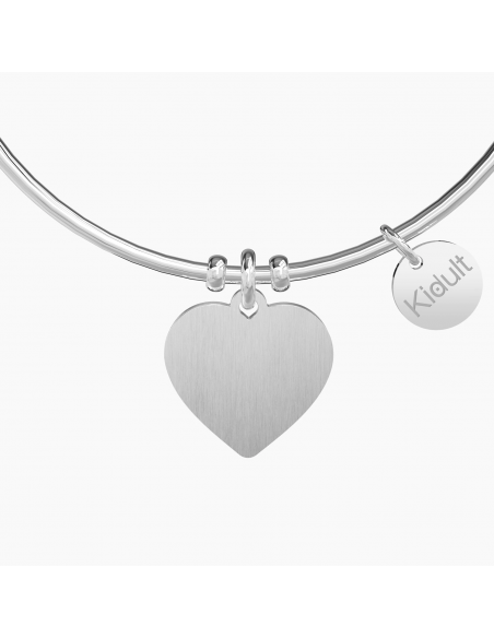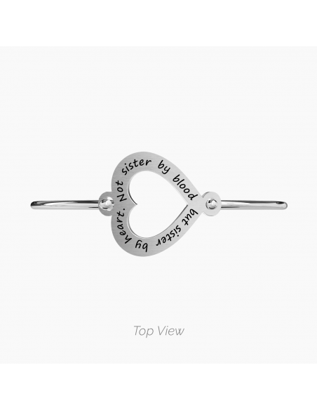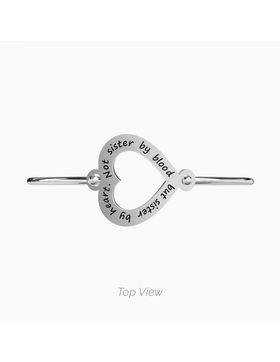 Not sister by blood, but sister by heart. Bangle in acciaio con ciondolo satinato a cuore e chiusura satinata a cuore.
