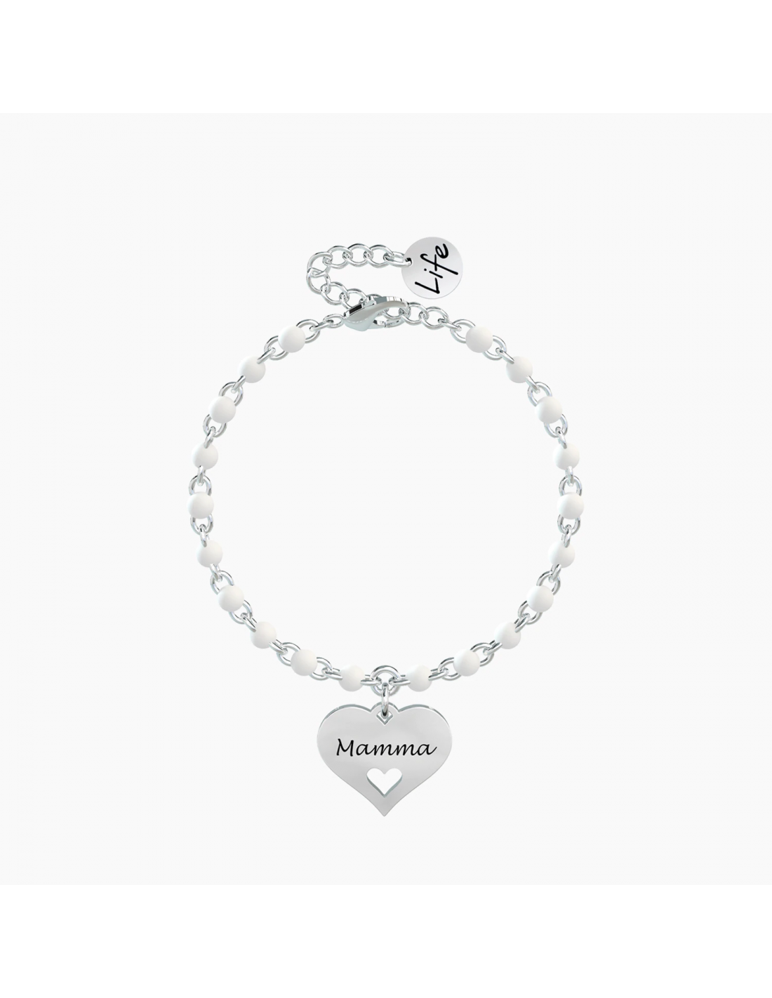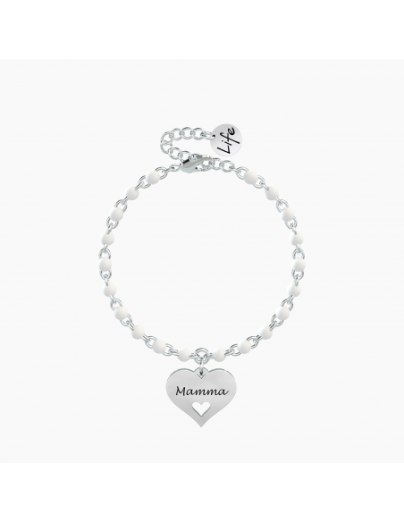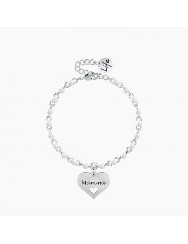 Bracciale in acciaio con ciondolo a cuore e catena rol con inserimenti in smalto bianco.