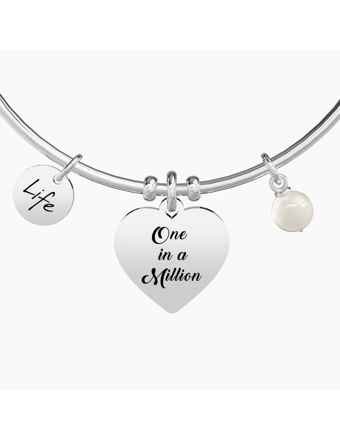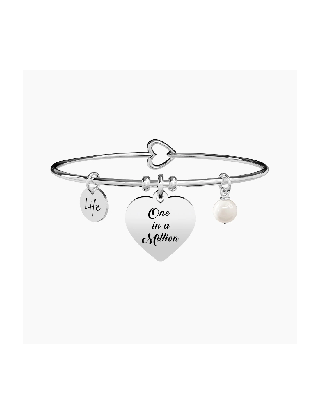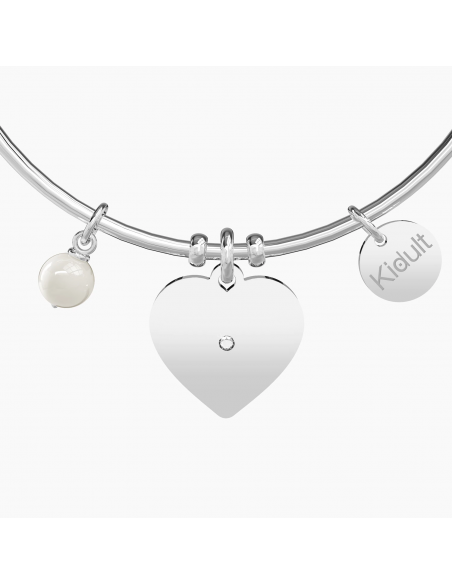 Bracciale elastico con sfere in acciaio, ciondolo a cuore e perla coltivata.