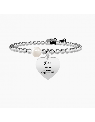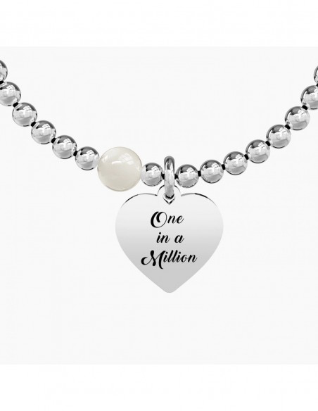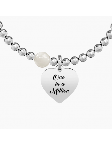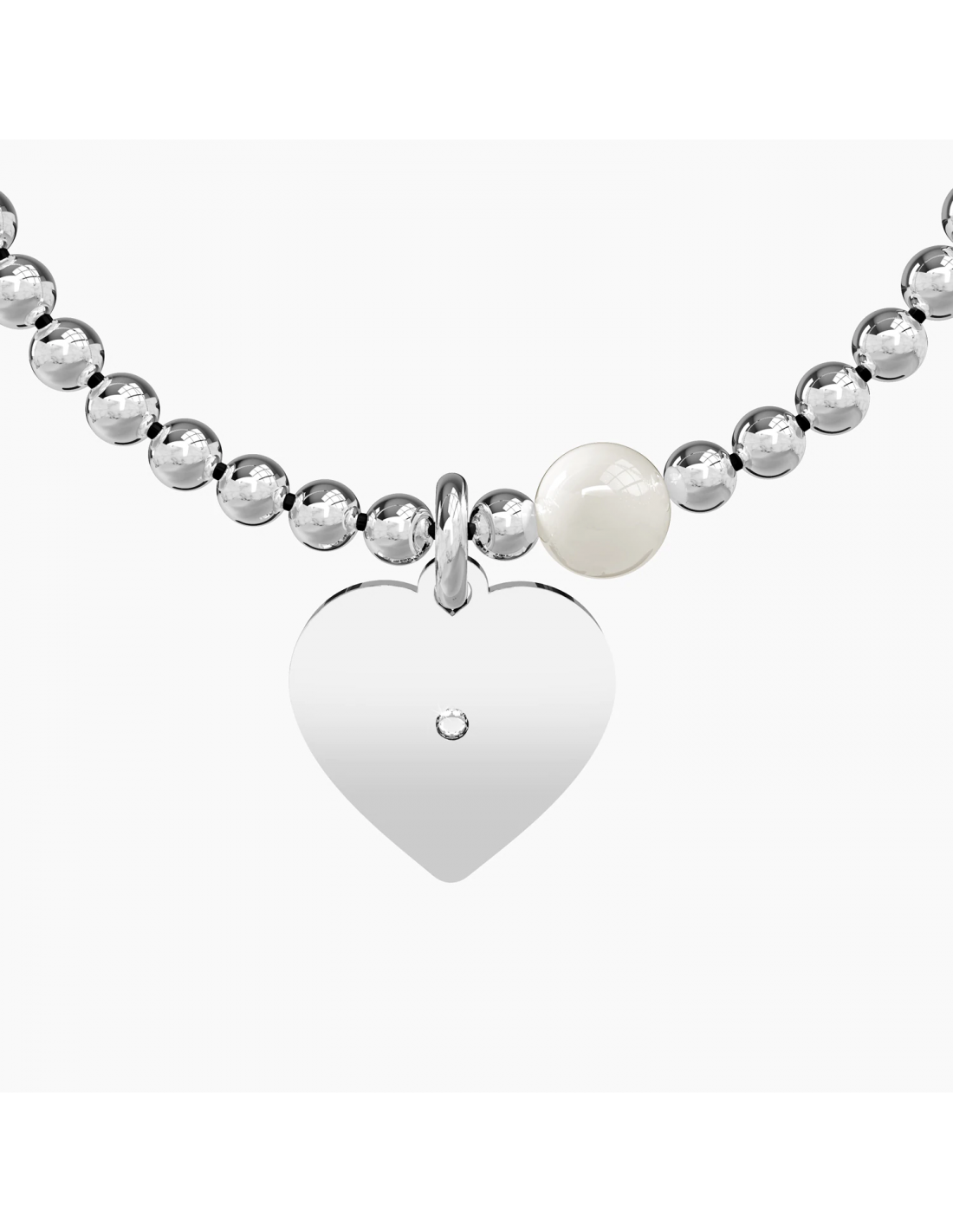 Tu cos“ diversa, inimitabile, unica. In questo universo, nessuno  come te. Sei una tra un milione, una vera perla rara. Bangle in acciaio con ciondolo a cuore e piccolo ciondolo con perla coltivata.