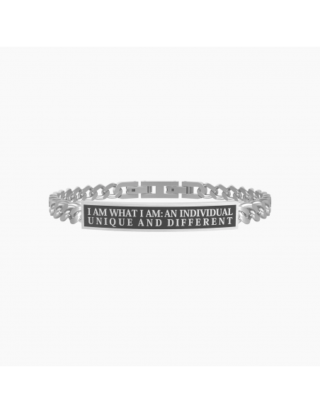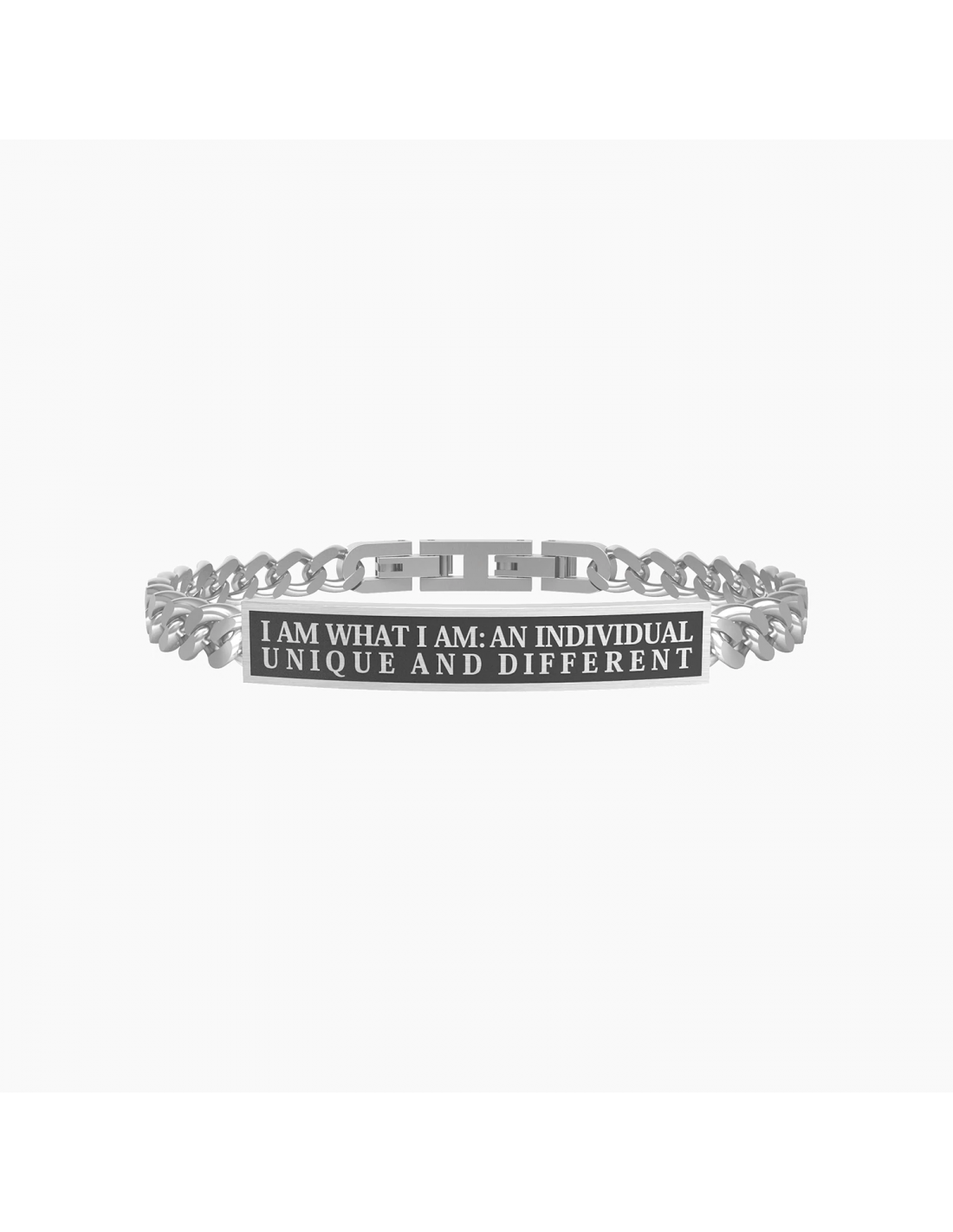 Bracciale in acciaio satinato con catena groumette e piastra rettangolare di colore nero.
