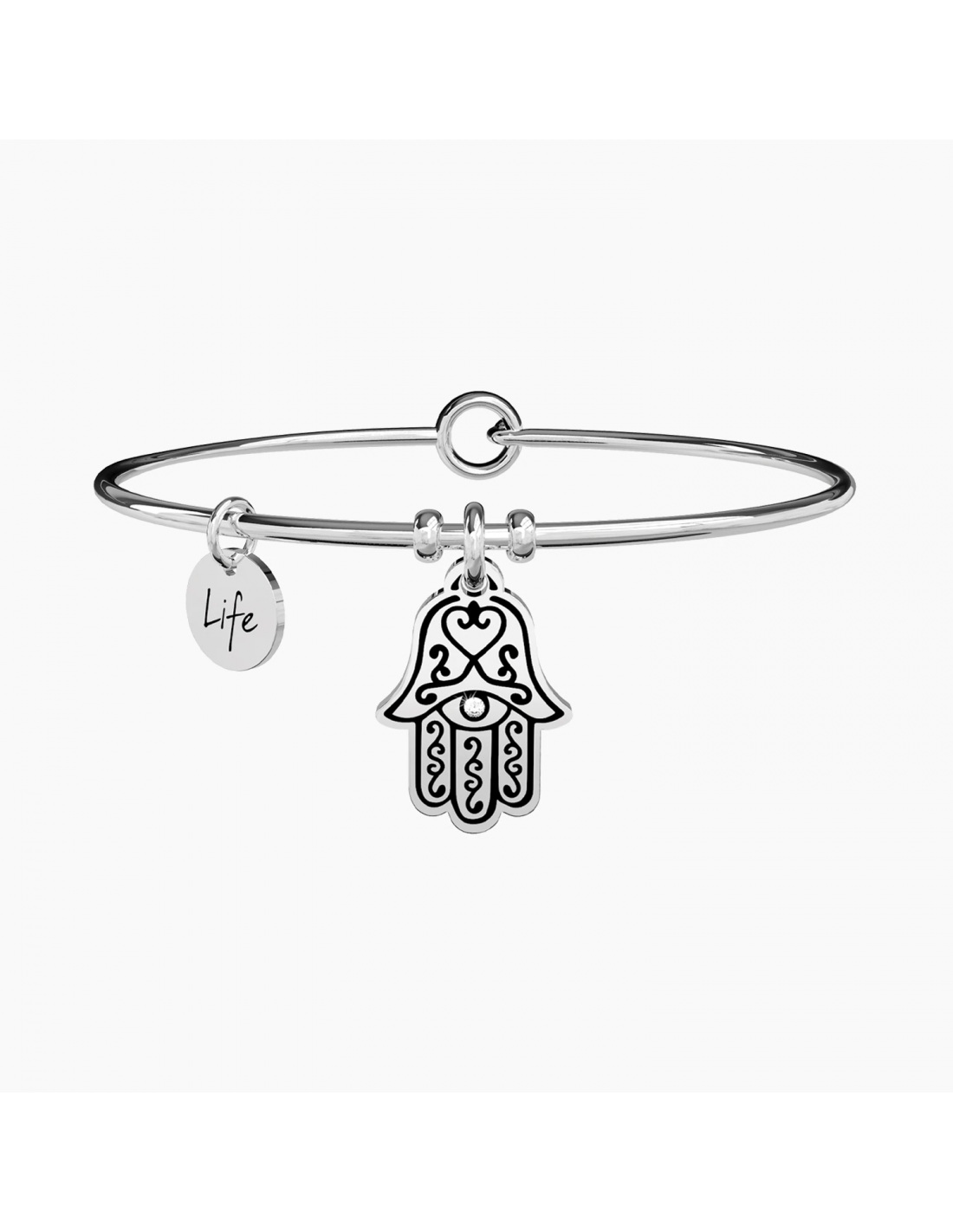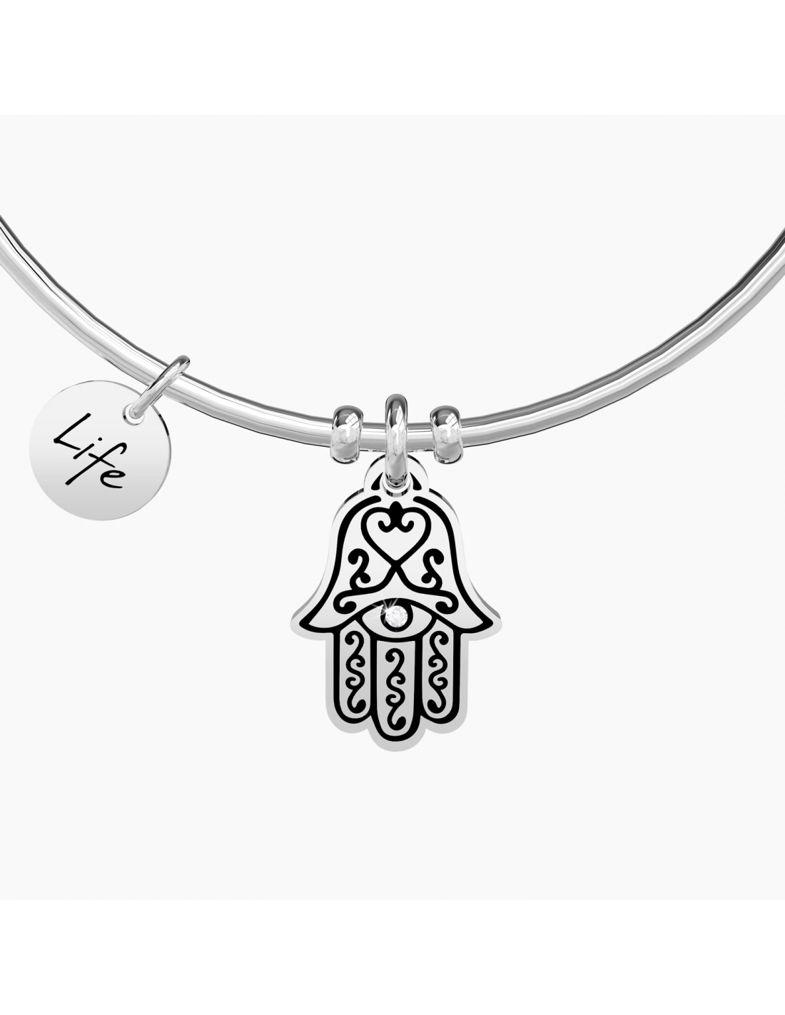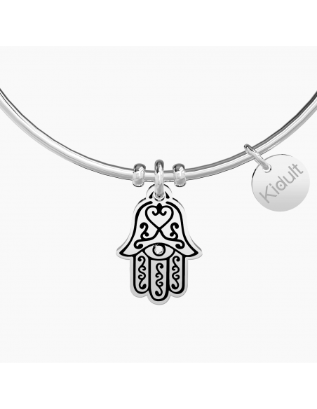 Mano che protegge, custodisce, accarezza. Ovunque tu andrai, questo prezioso amuleto ti porterˆ fortuna e felicitˆ. Bangle in acciaio con ciondolo Mano di Fatima.