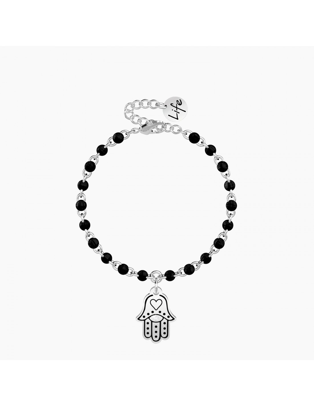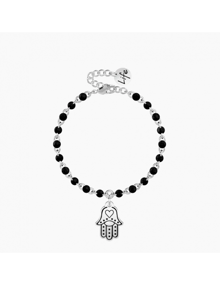 Bracciale in acciaio con ciondolo mano di fatima e catena rol con inserimenti in smalto nero.