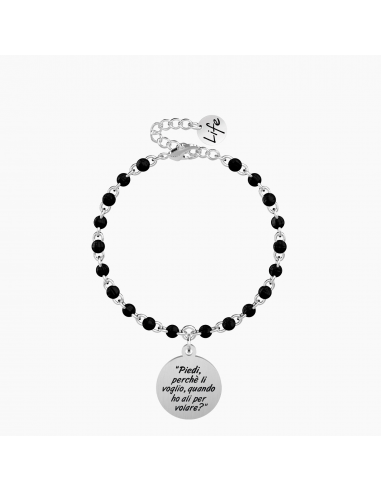 Frida Kahlo Official Collection "Piedi, perchŽ li voglio, quando ho ali per volare?" - Frida Kahlo - Bracciale in acciaio con ciondolo satinato tondo e catena rol˜ con inserimenti in smalto nero.