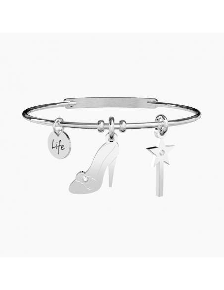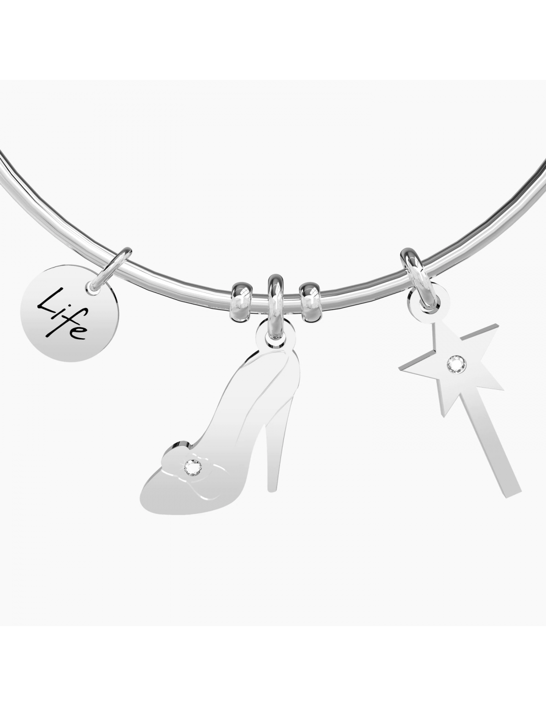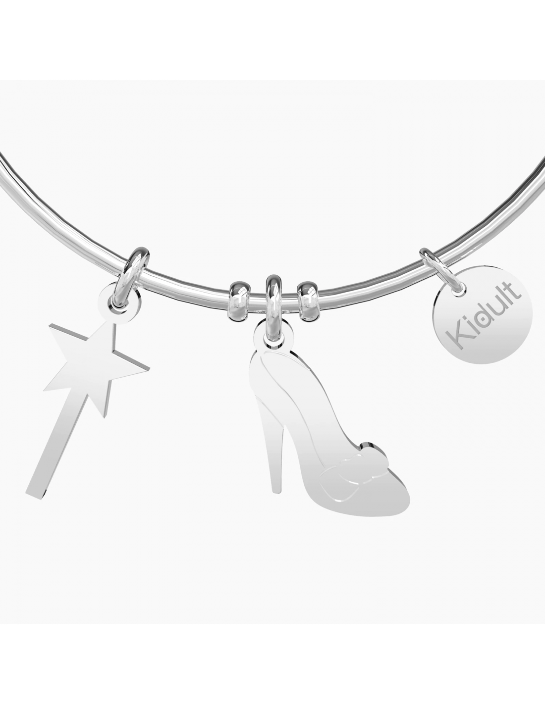 Bangle in acciaio con ciondoli a forma di scarpetta e di bacchetta magica.