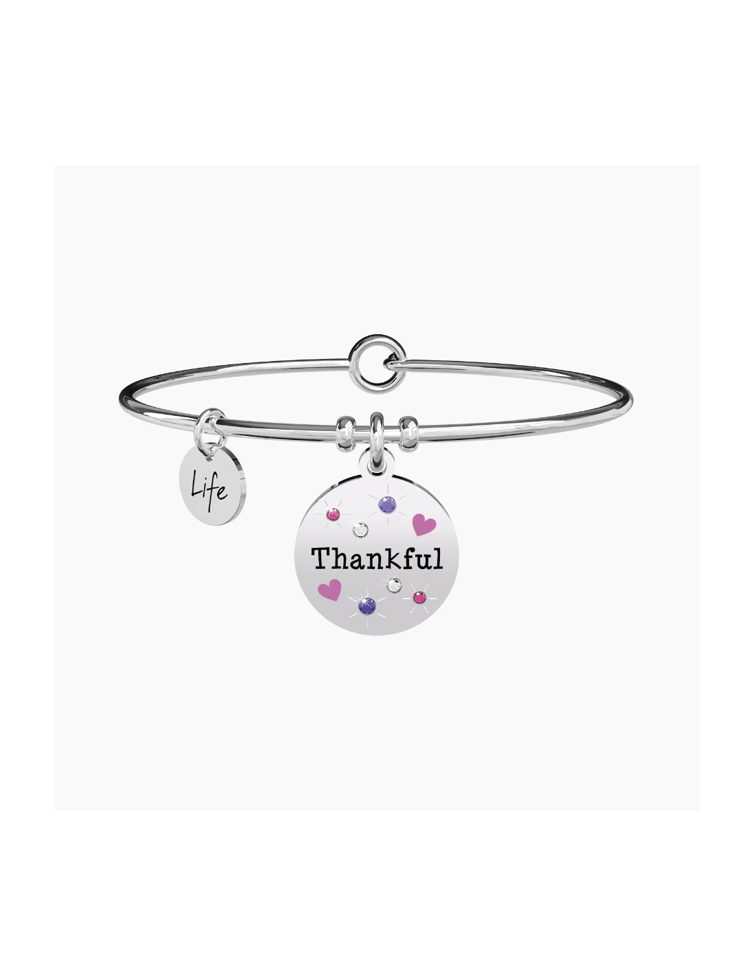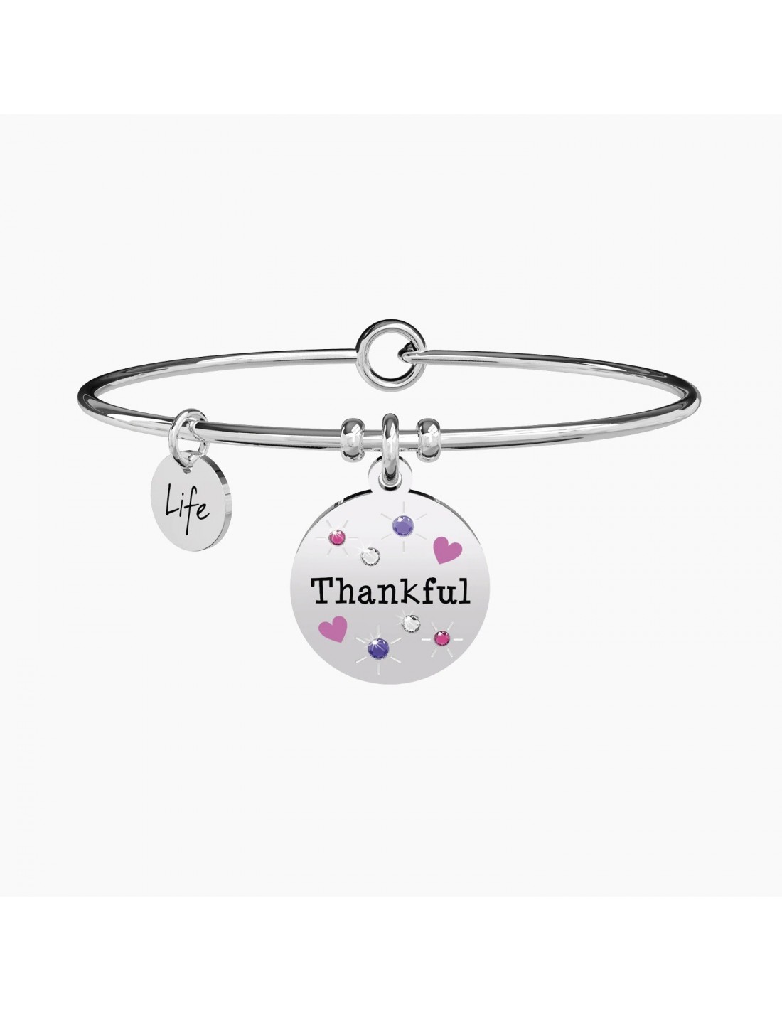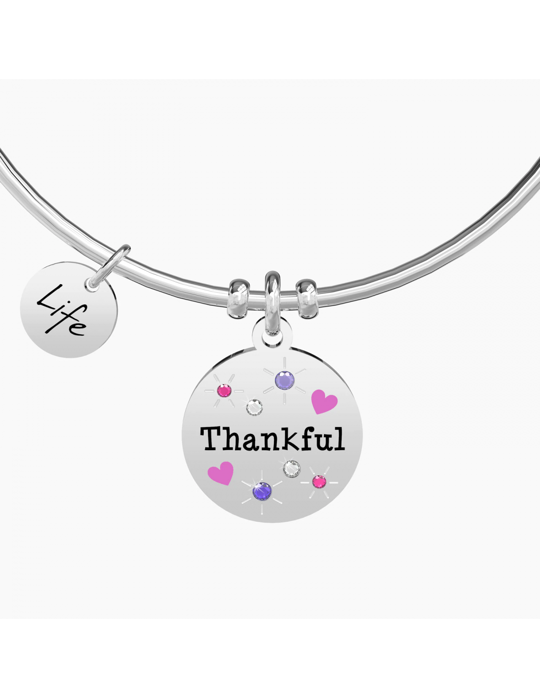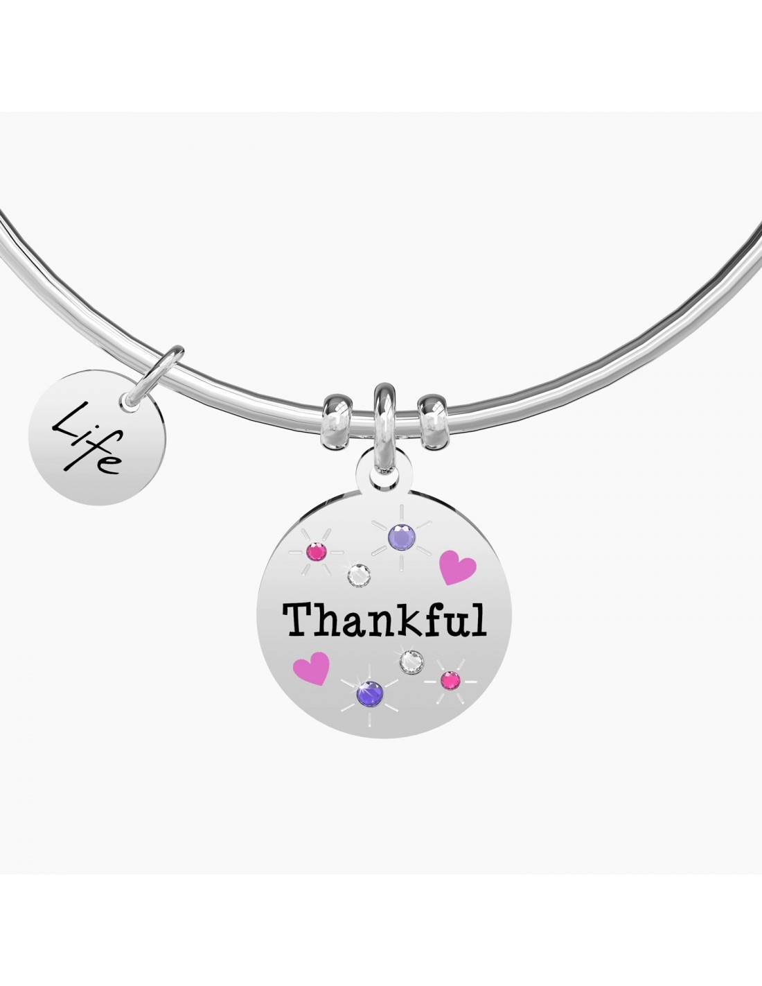 Non riesco a trovare le parole giuste per ringraziarti. L'unica che merita davvero ... grazie! Bangle in acciaio con ciondolo tondo con cristalli colorati e applicazioni smaltate.