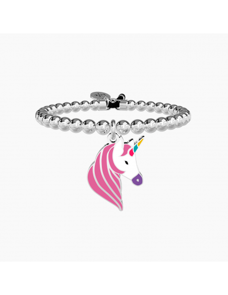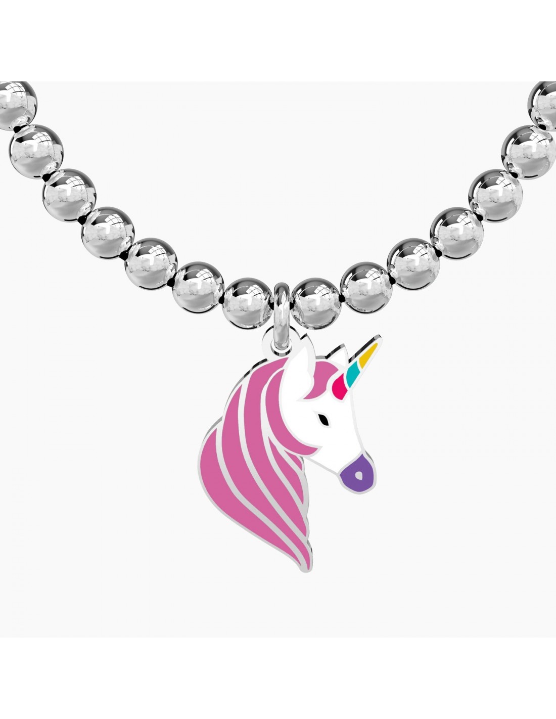 Continua a sognare, insegui i tuoi desideri e come per magia spiccherai il volo attraverso tutti i colori dell'arcobaleno. Bracciale elastico con sfere in acciaio e ciondolo a forma di unicorno smaltato.