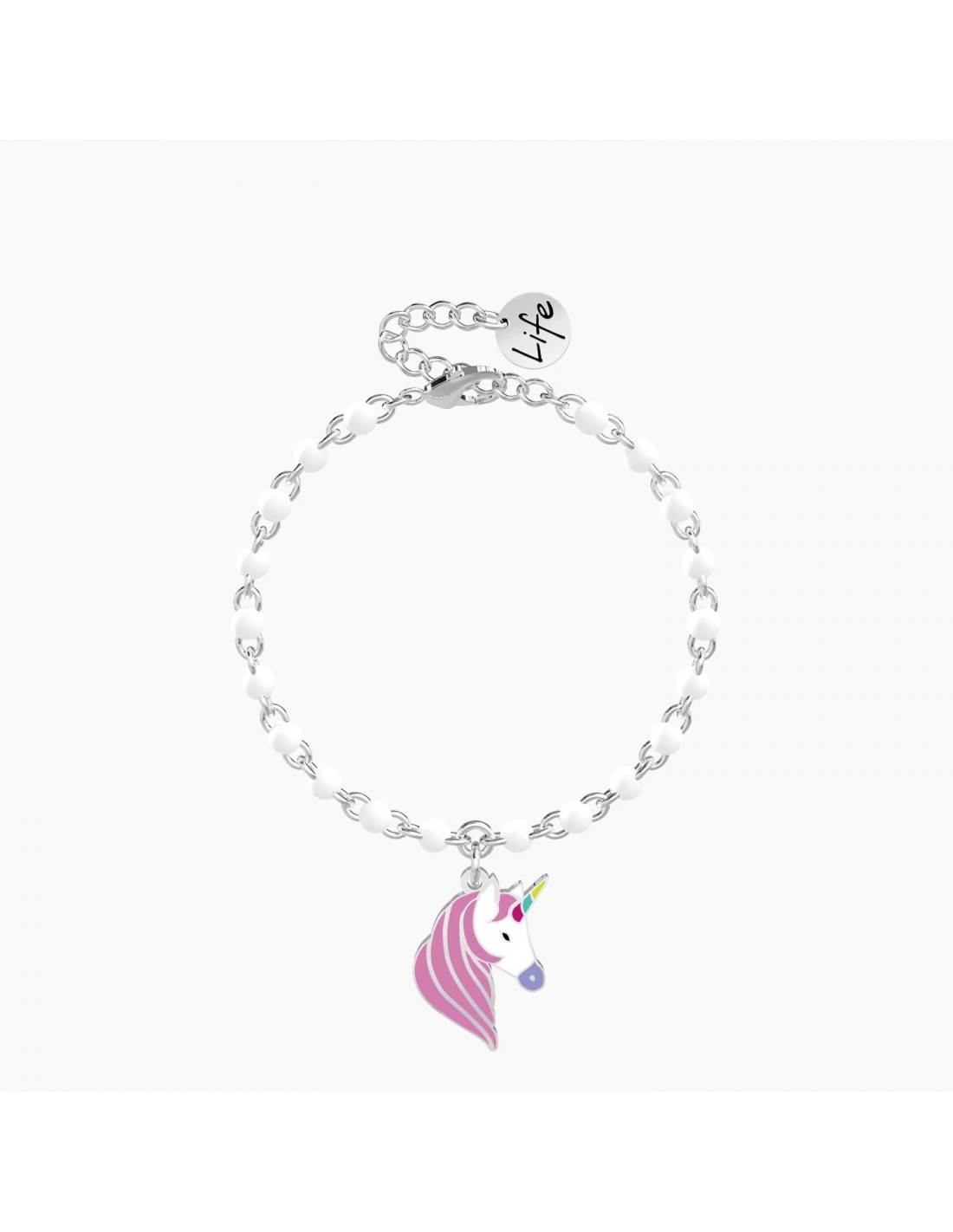 Bracciale in acciaio con ciondolo a forma di unicorno smaltato e catena rol con inserimenti in smalto bianco.