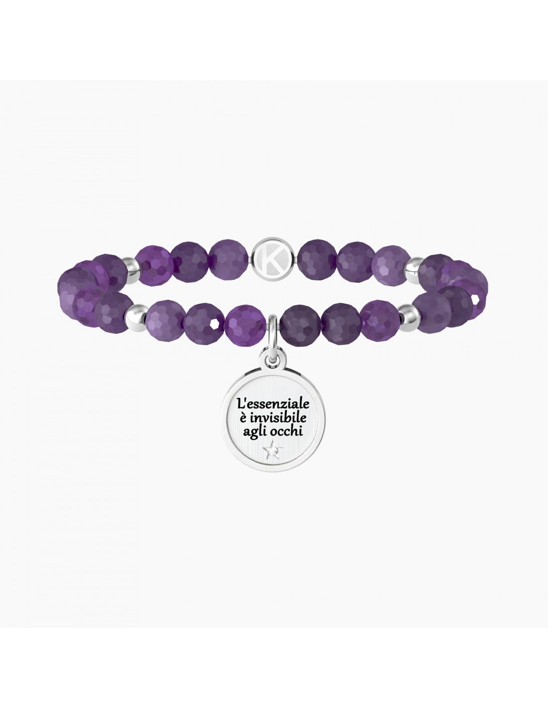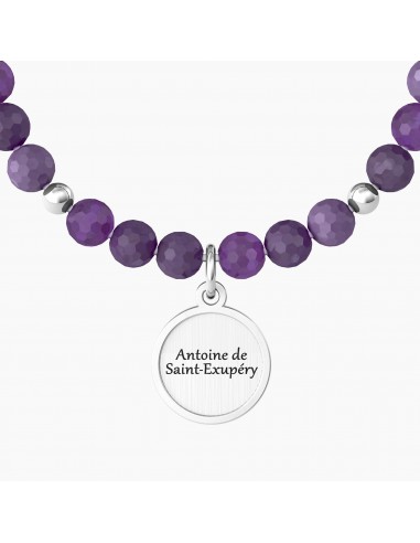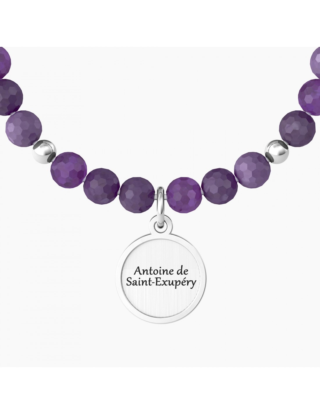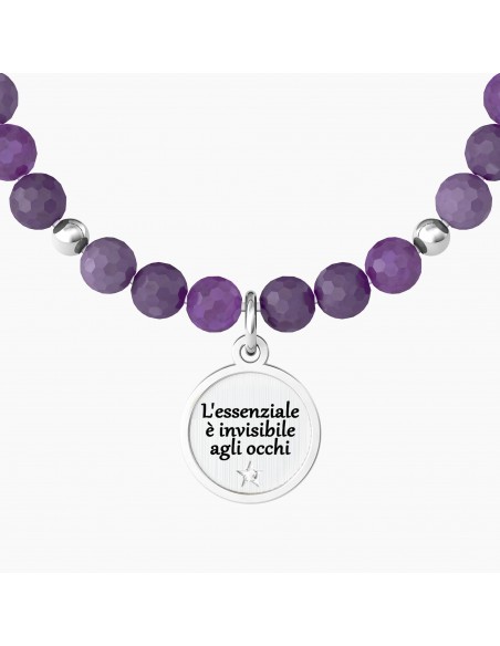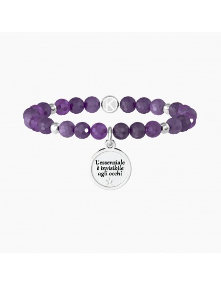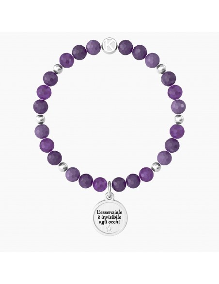 Bracciale elastico con sfere in ametista e ciondolo tondo in acciaio satinato color argento e rifinitura lucida tono su tono. Citazione incisa e punto luce sul fronte. Frase di Antoine de Saint-Exupéry "L'essenziale è invisibile agli occhi".