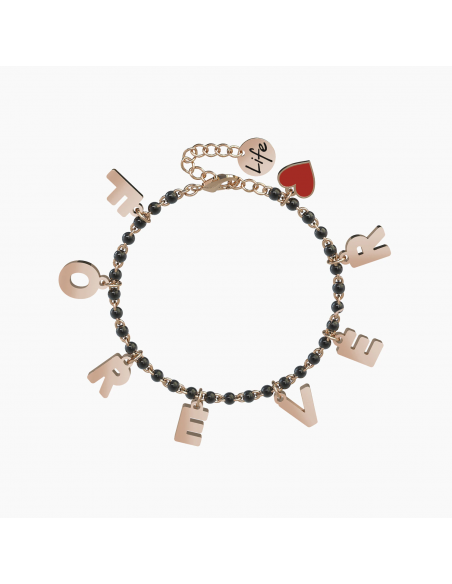 Bracciale in acciaio color oro rosa con ciondoli Forever, ciondolo a cuore con smalto rosso e catena rol con inserimenti in smalto nero.