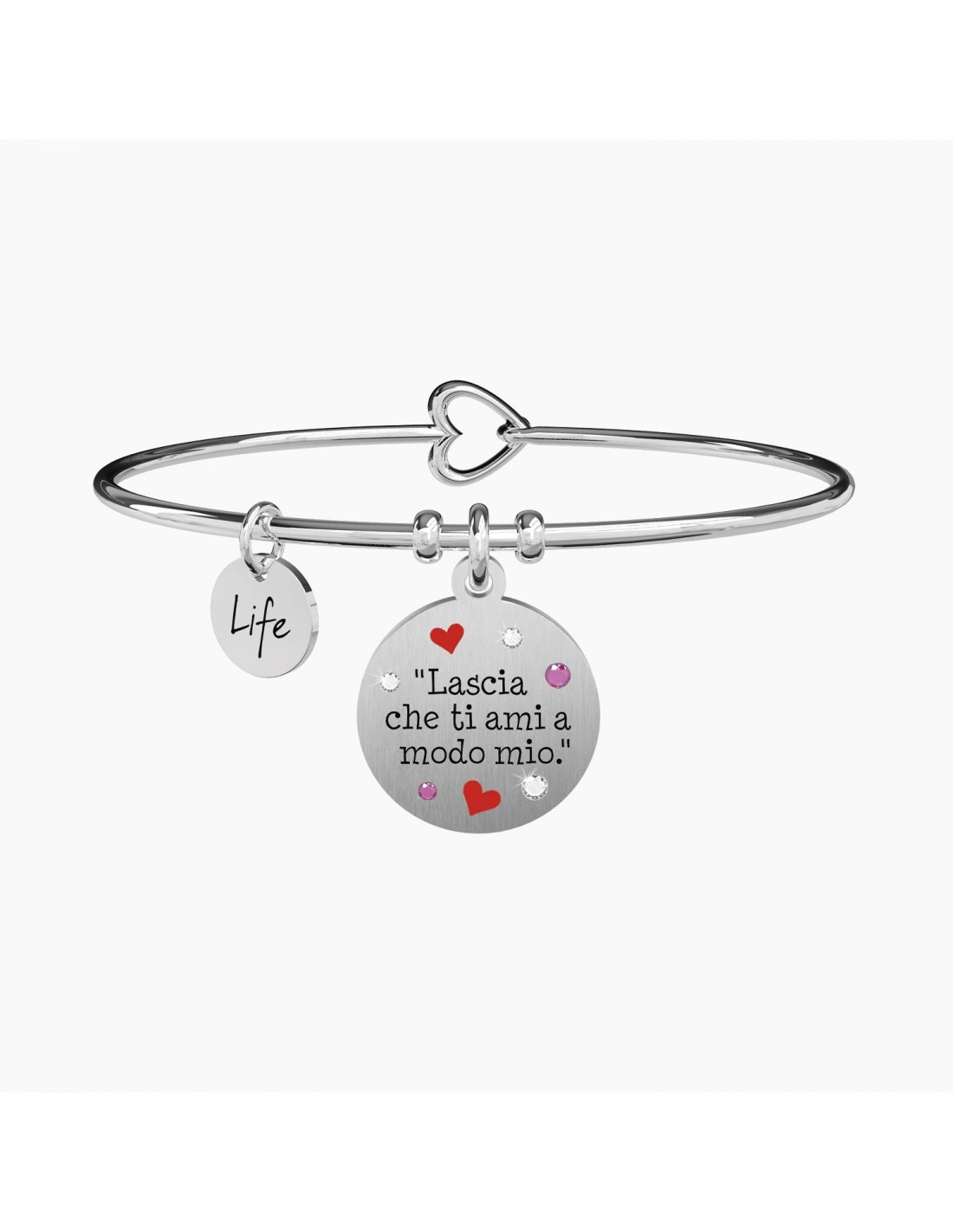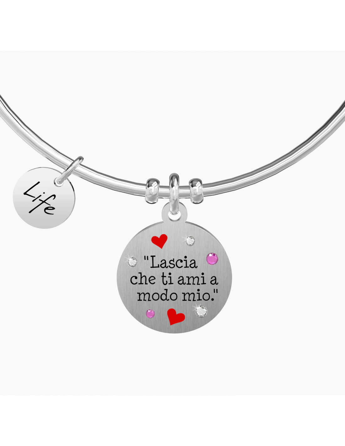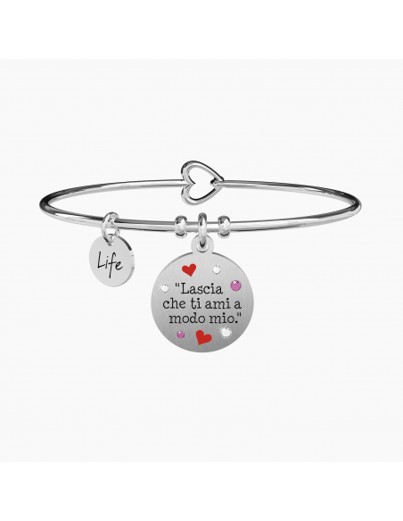 "Lascia che ti ami a modo mio". - Gustave Flaubert - Bangle in acciaio con ciondolo tondo satinato con cristalli colorati e applicazioni smaltate.